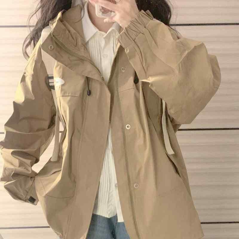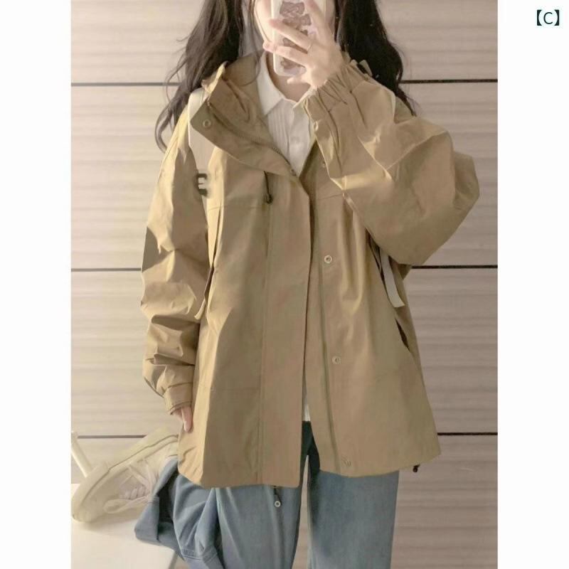 マウンテンパーカー レディース スプリング 秋 カレッジスタイル カジュアル フード付き 防風 ポリエステル 無地 黒 ブラック カーキ S M L XL 2XL