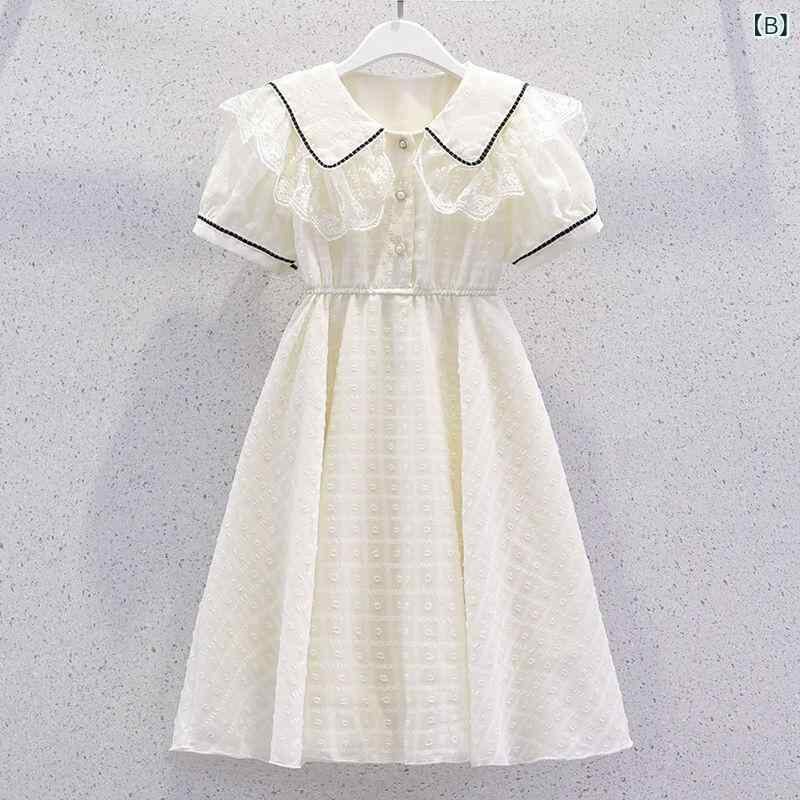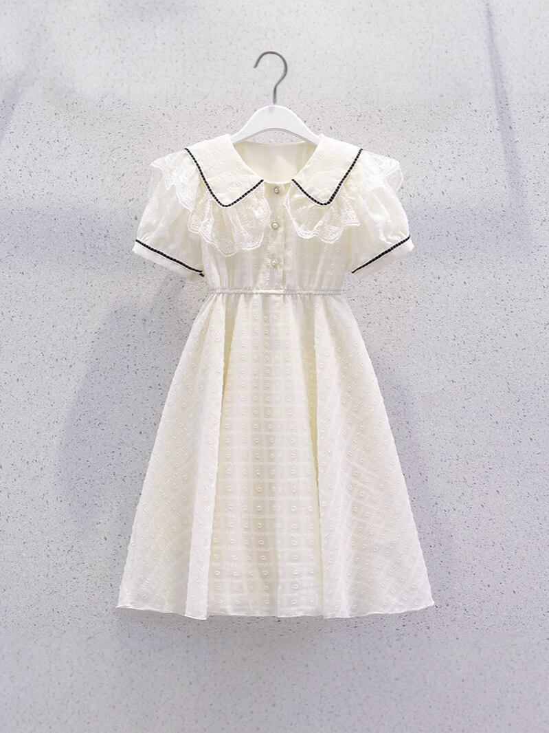 ワンピース 女の子 上品 フレンチシック 夏 薄手 シフォン レース襟 プリンセス Aライン ロング丈 子供服 ドレス お出かけ 発表会 ピンク アプリコット キッズ ジュニア