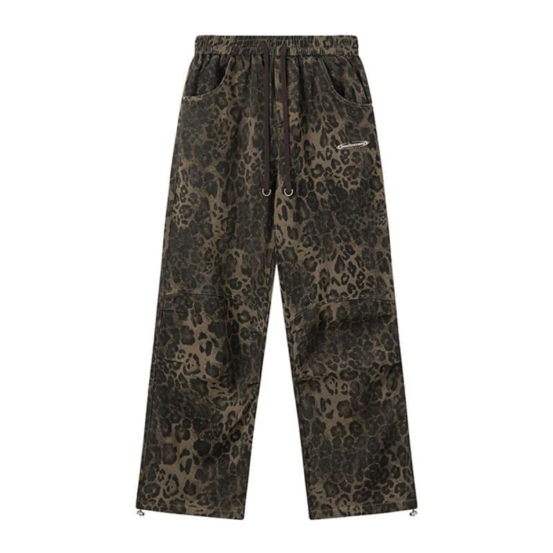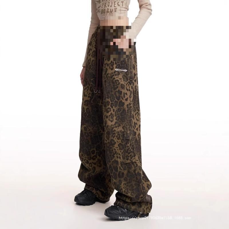 パンツ レディース アメリカンレトロ ヒョウ柄 デニム ストレート 軽快な デザイン性 個性的 カジュアル プリント加工 伸縮性あり 大人向け リラックス感のある ロング丈
