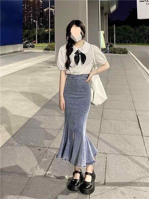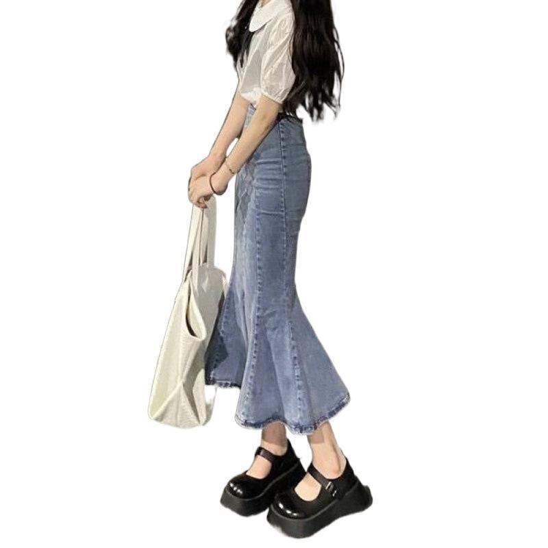 スカート 女性用 ハイウエスト デニム ジーンズ フリル ストレッチ タイト スリム ペンシル ミディ丈 マーメイドスカート 膝丈 スカート タイトスカート スリット入り デニムスカート カジュアル フェミニン エレガント 着回し力抜群