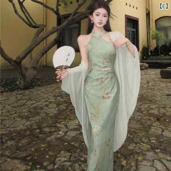 ワンピース レディース チャイナドレス ホルターネック 花柄 ロング丈 新中国風 禅スタイル 優雅 涼しげ 普段使い 夏