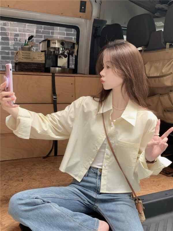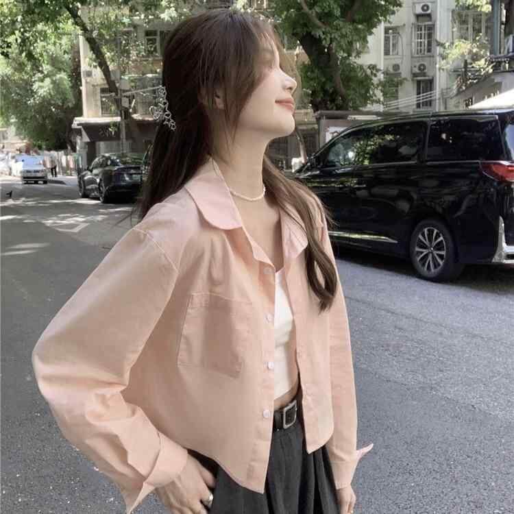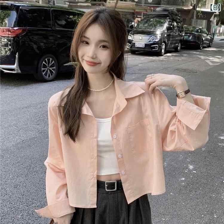 シャツ レディース 女性用 韓国系 ピンク ポロ襟 長袖 ゆったり カジュアル 着回し UVカット 短め丈 前開き トップス ポリエステル製 ゆったりシルエット 前ボタン