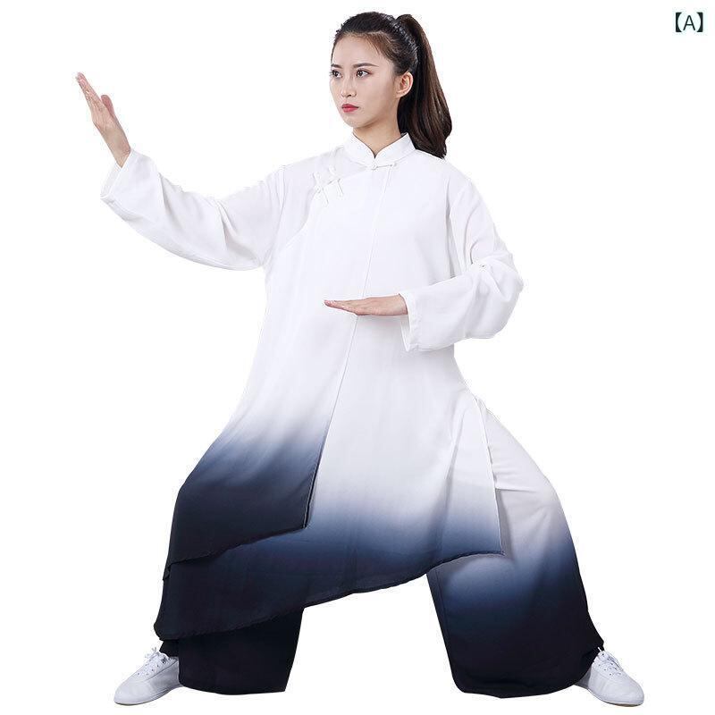 太極拳ウェア レディース 女性用 春夏 ポリエステル繊維 化繊混紡 グラデーションカラー ミドル丈 ロング丈 競技用 練習着 演武服 発表会 武術服 白系水墨 吸湿速乾 通気性 快適 スタイリッシュ