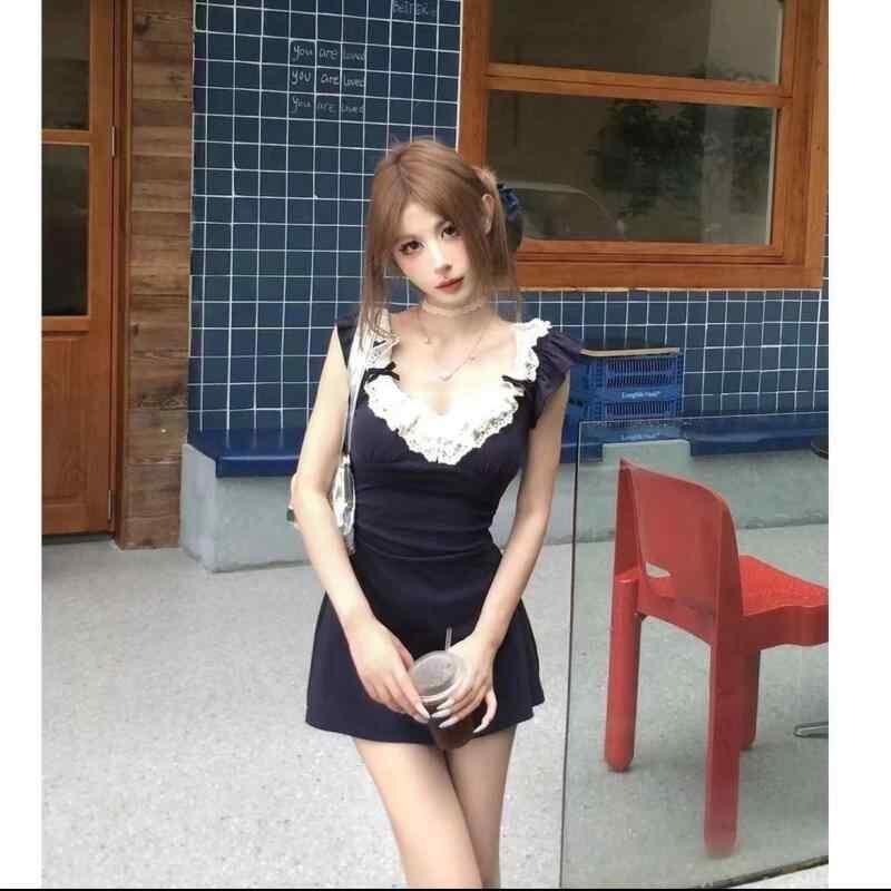 ワンピース レディース 甘辛ミックス スタイル レース切り替え ミニフリル袖 ポロ襟 セクシー スリット タイトシルエット Aライン ウエストマーク ロング丈 ポリエステル素材 夏用