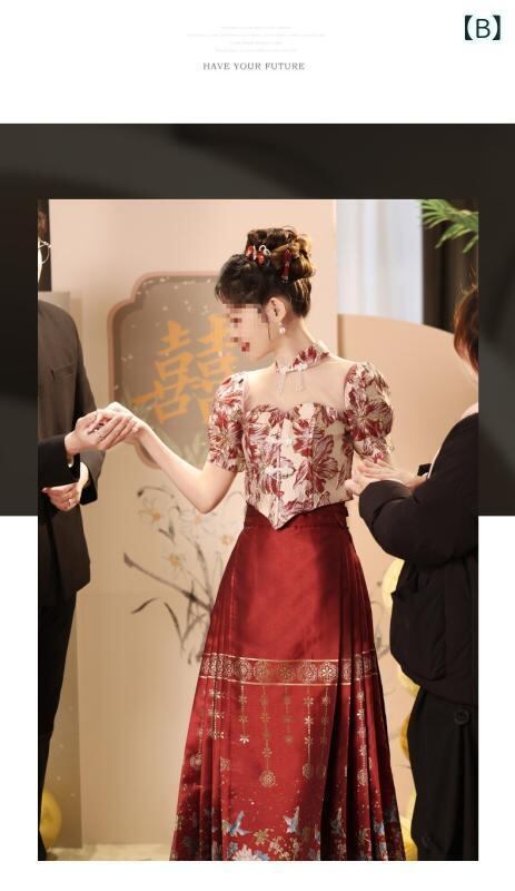 ドレス レディース 女性用 レッド 赤色 馬面スカート 秀禾服 結婚式 披露宴 お色直し フォーマルドレス 花嫁 婚礼衣装 結納 婚約式 新中国風 モダンチャイナ Aライン ロング丈 五分袖 ポリエステル エレガント 上品 高級感
