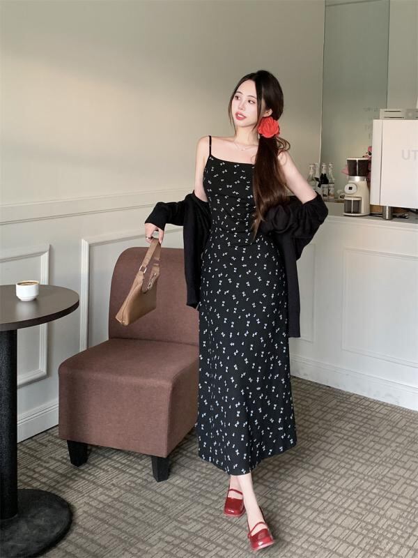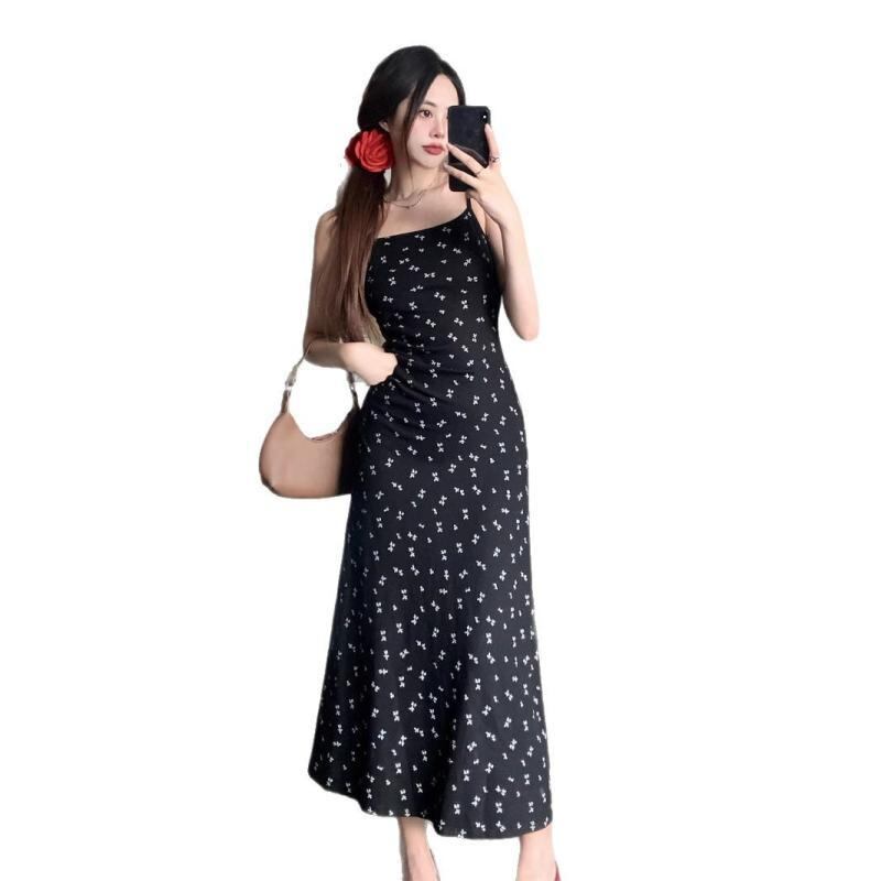 ワンピース レディース 小花柄 ロング丈 キャミソール スクエアネック ノースリーブ ハイウエスト Aライン アメリカンスタイル 綿混 ストレッチ スリムフィット 細見え 体型カバー フェミニン ガーリー