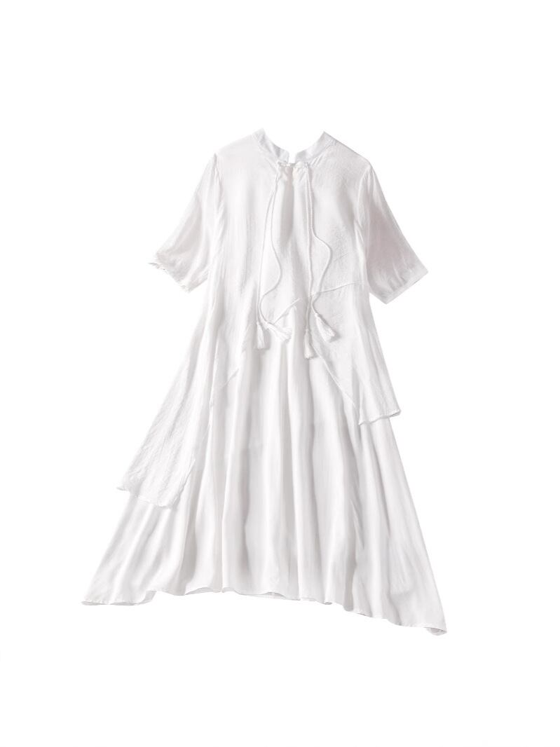 ワンピース レディース チャイニーズモダン レトロ 上品 半袖 スタンドカラー チャイナボタン フリル フリンジ リボン Aライン ミモレ丈 ゆったり ホワイト 再生繊維