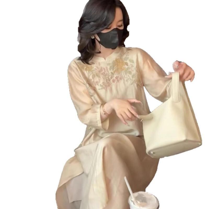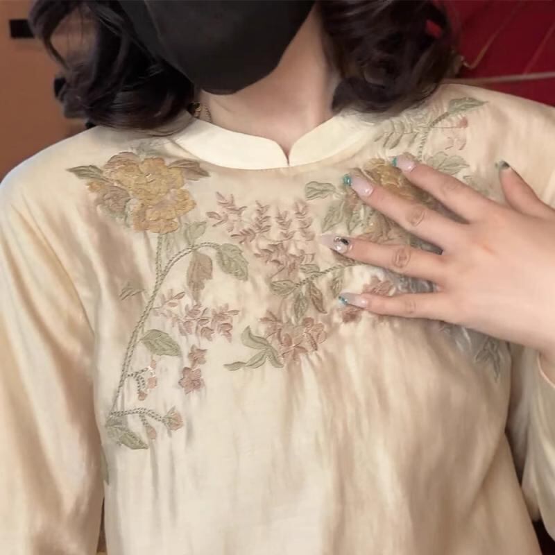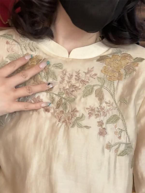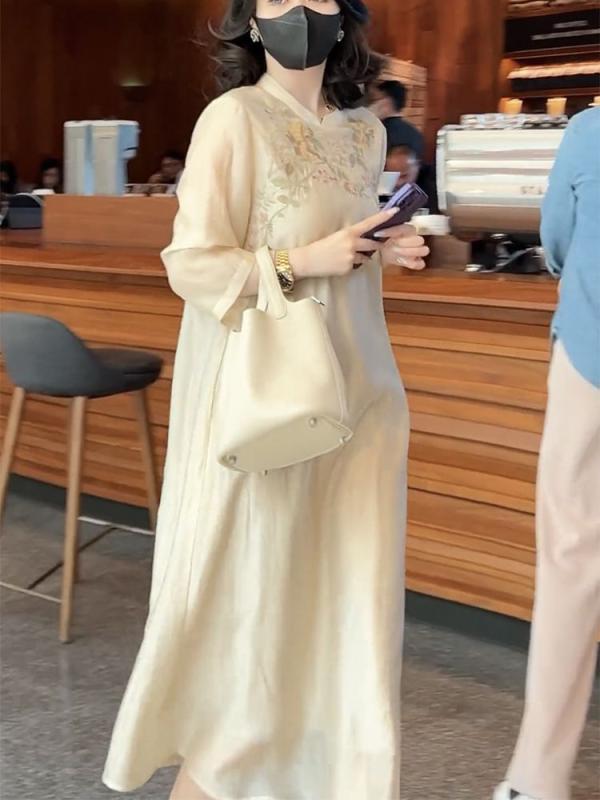 ワンピース ドレス レディース フェミニン 中華風 レトロ刺繡 改良チャイナドレス ゆったり 大きいサイズ 着痩せ効果 Aライン Vネック 半袖 ハイウエスト ミモレ丈 ポリエステル アプリコット