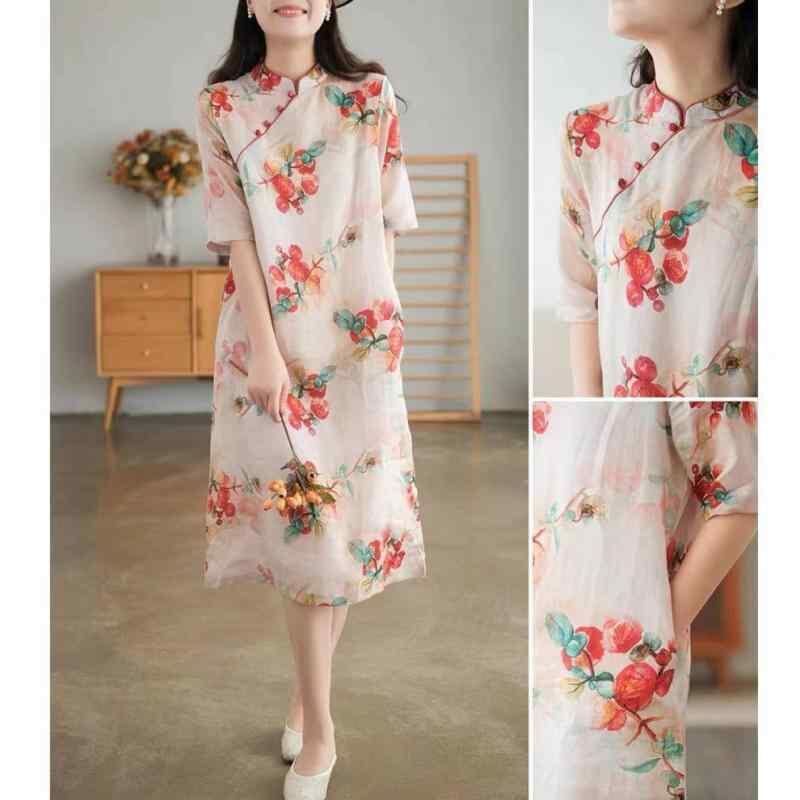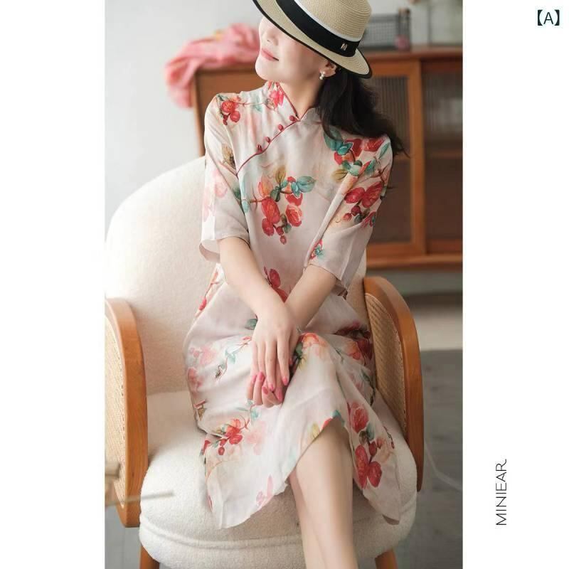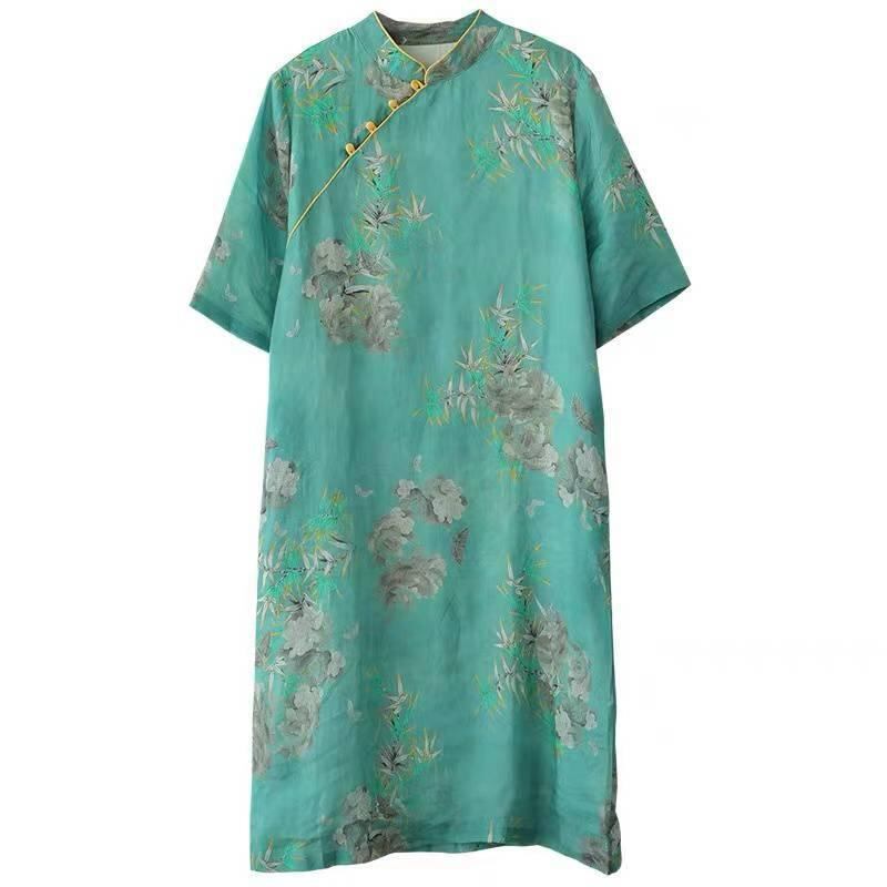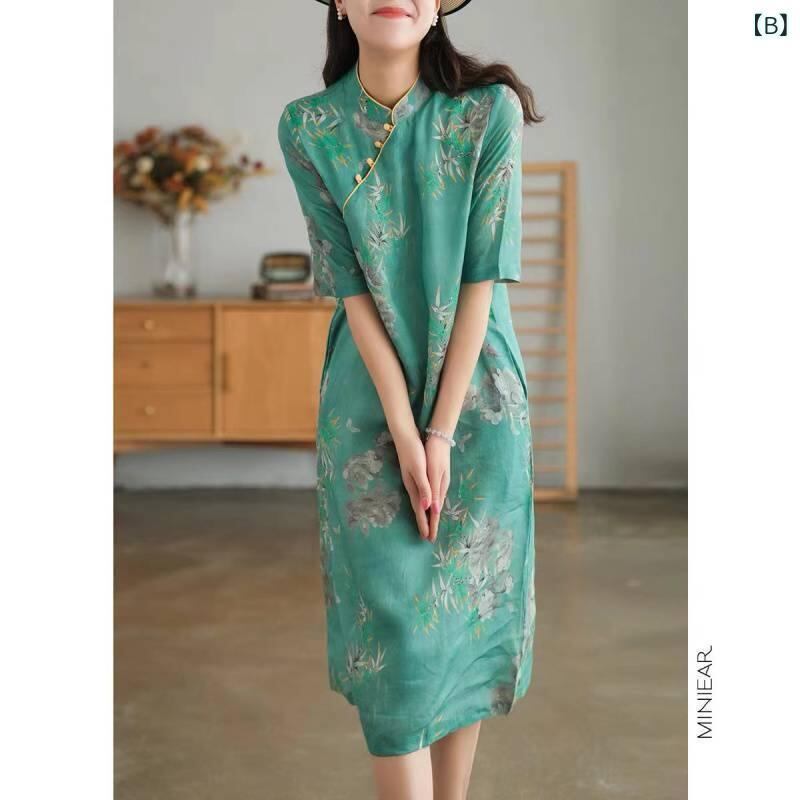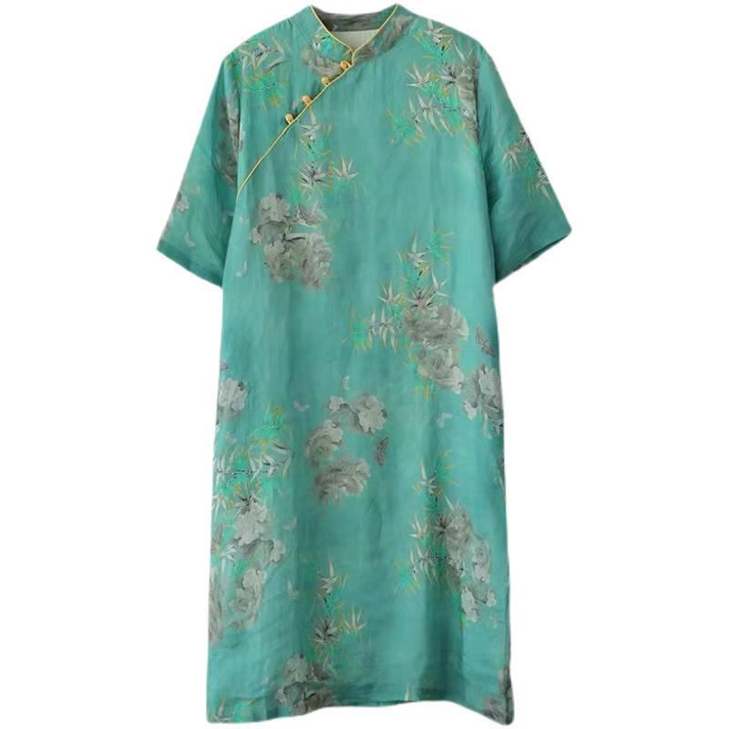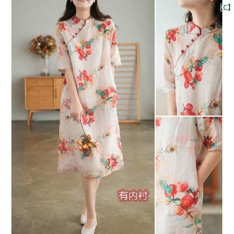 ワンピース レディース 綿麻 レトロ 旗袍風 大きいサイズ ゆったりサイズ スタンドカラー 五分袖 花柄 プリント Aライン ミモレ丈 カジュアル ナチュラル 吸湿速乾 レッド グリーン 赤 緑