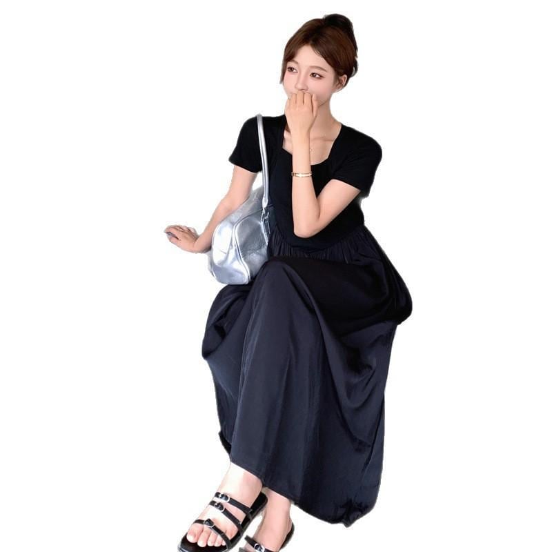 ワンピース レディース 大きいサイズ プラスサイズ 黒 ブラック ヘプバーン風 スクエアネック 半袖 ロング丈 体型カバー 着痩せ効果 Aライン 無地 エレガント 上品 通勤 オフィス デイリーユース ポリエステル素材
