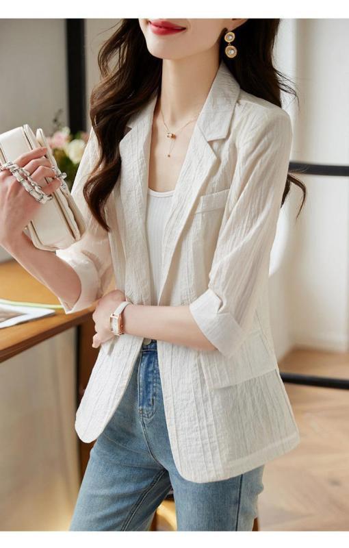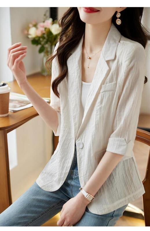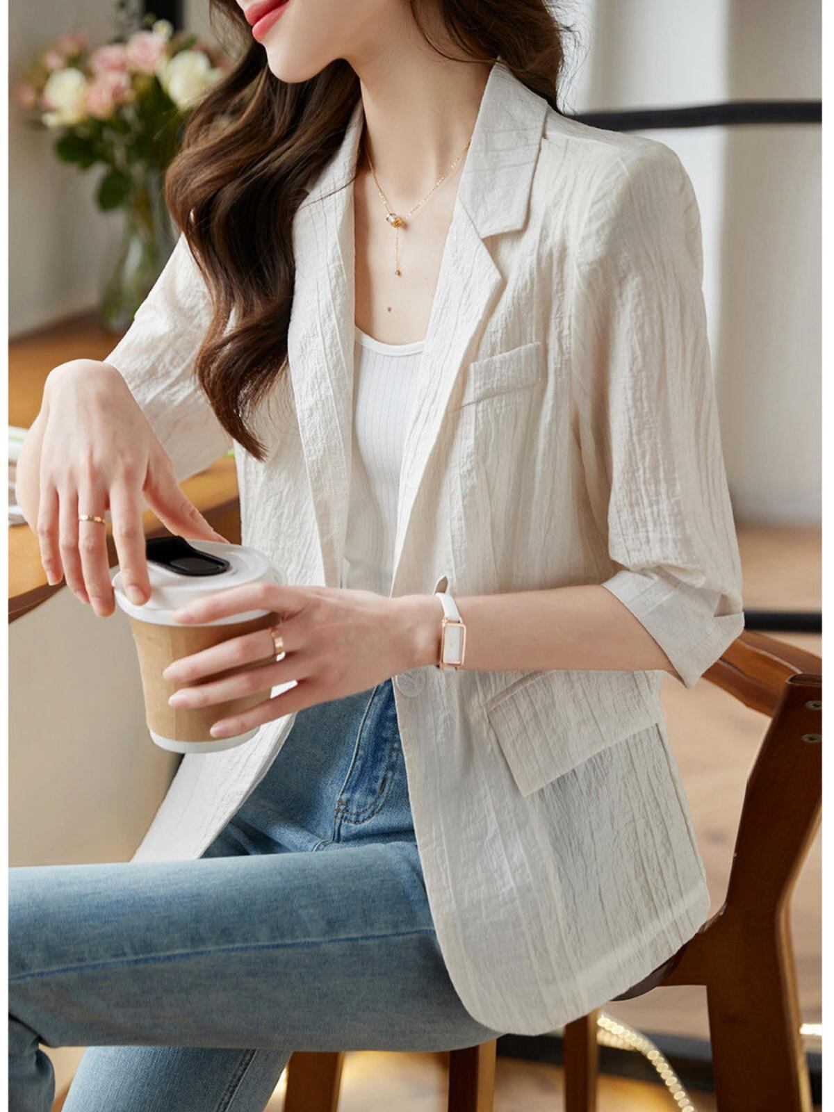 ジャケット レディース 五分袖 雪紡 シフォン サマージャケット 杏色 POLOネック 薄手 カジュアル 通勤 オフィススタイル 冷感 涼感