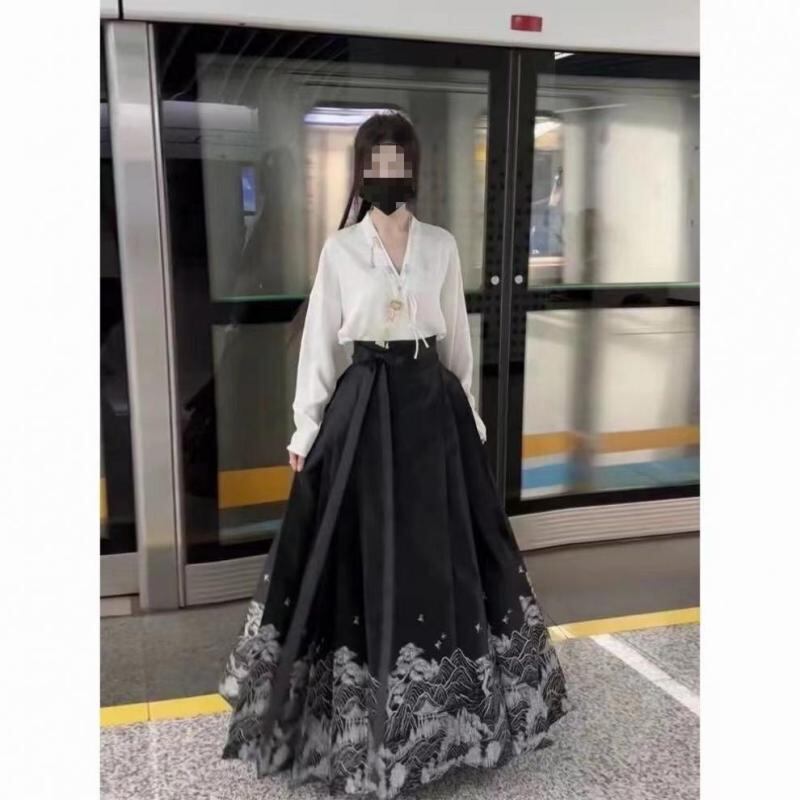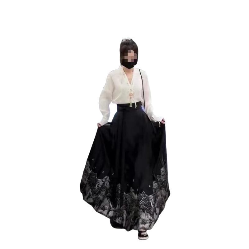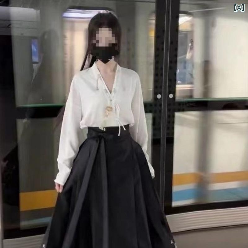 漢服 レディース 改良型 新中国風 馬面スカート プリーツスカート ブラウス セットアップ 無地 ポリエステル カジュアル 普段使い オールシーズン 明代風 民族衣装