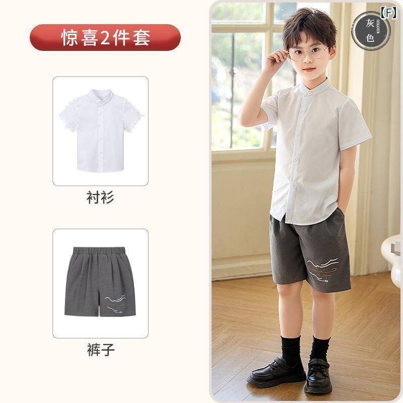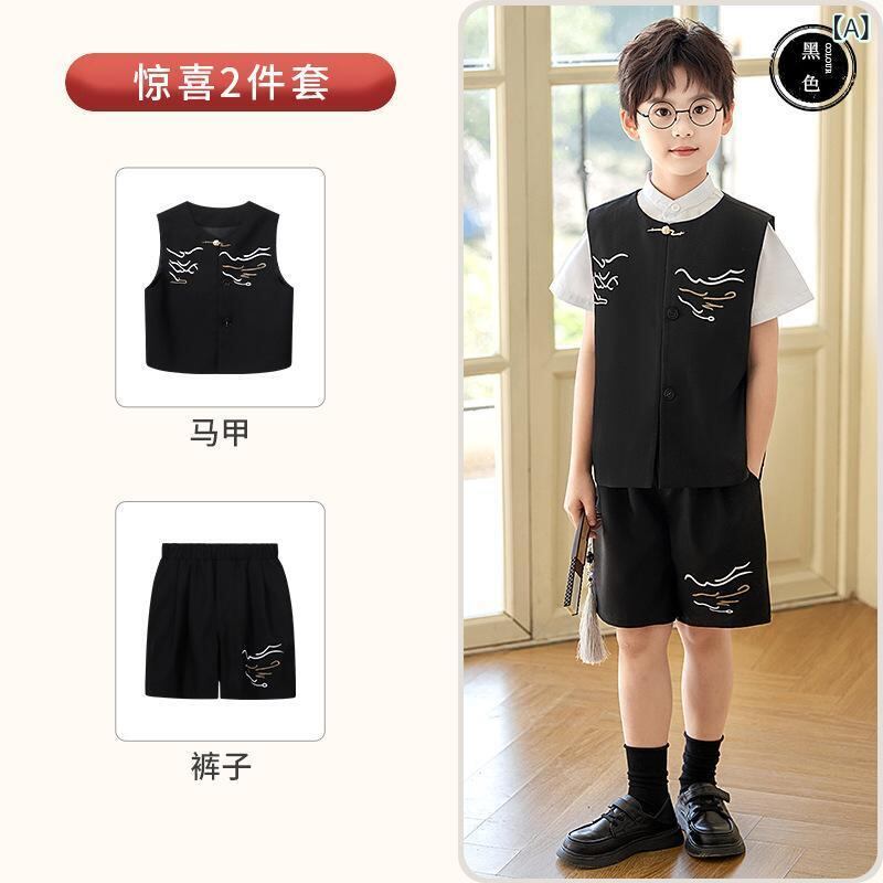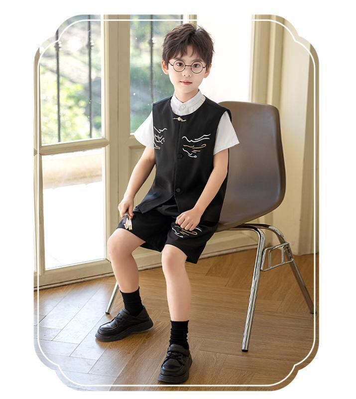 子供服 男の子 新中国風 漢服風 祥雲刺繍 ベスト ショートパンツ セットアップ 夏 フォーマル 発表会 舞台 演出 イベント お呼ばれ 結婚式 記念撮影 黒 グレー 快適素材