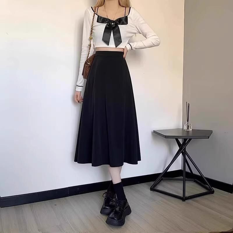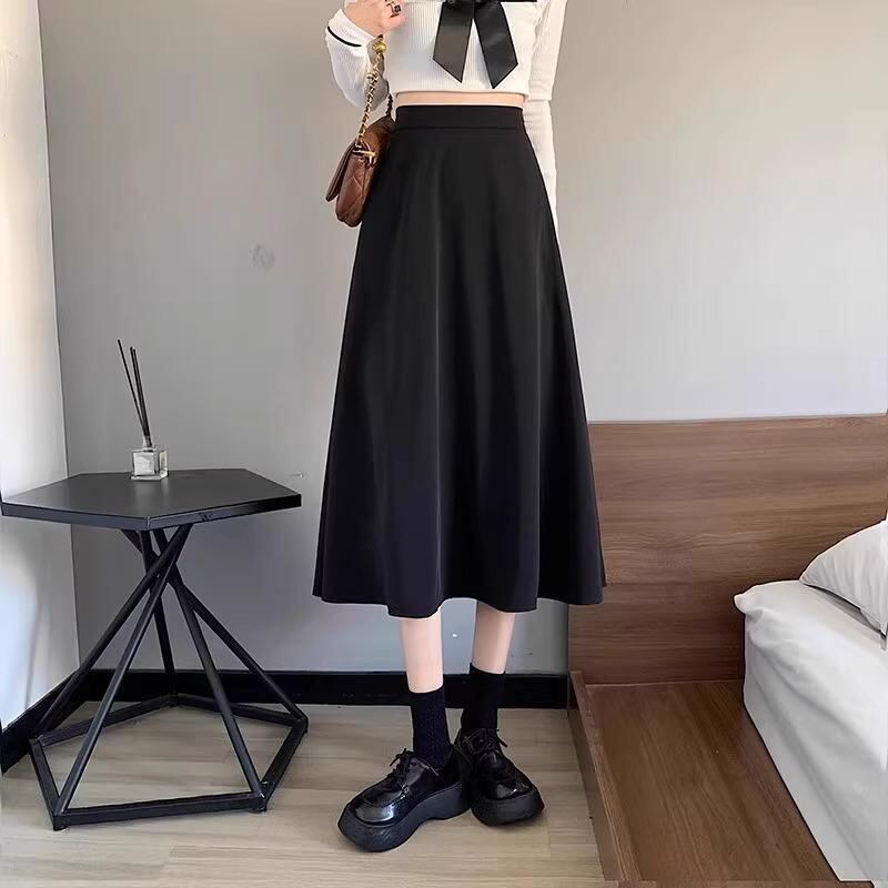 スカート レディース Aライン フレア ブラック ハイウエスト 着痩せ ミモレ丈 高級感 きれいめ ウエストゴム ポリエステル ストレッチ 無地 シワになりにくい