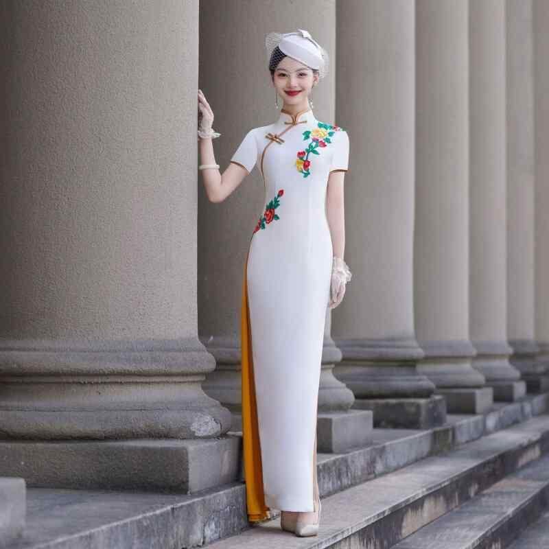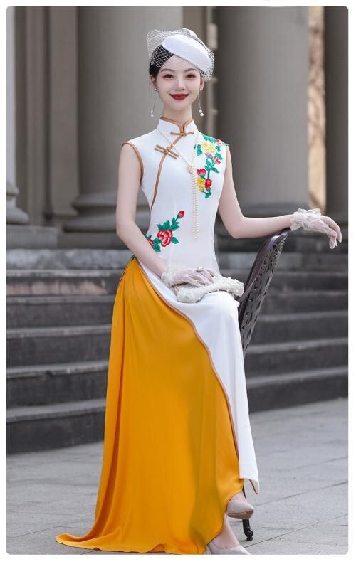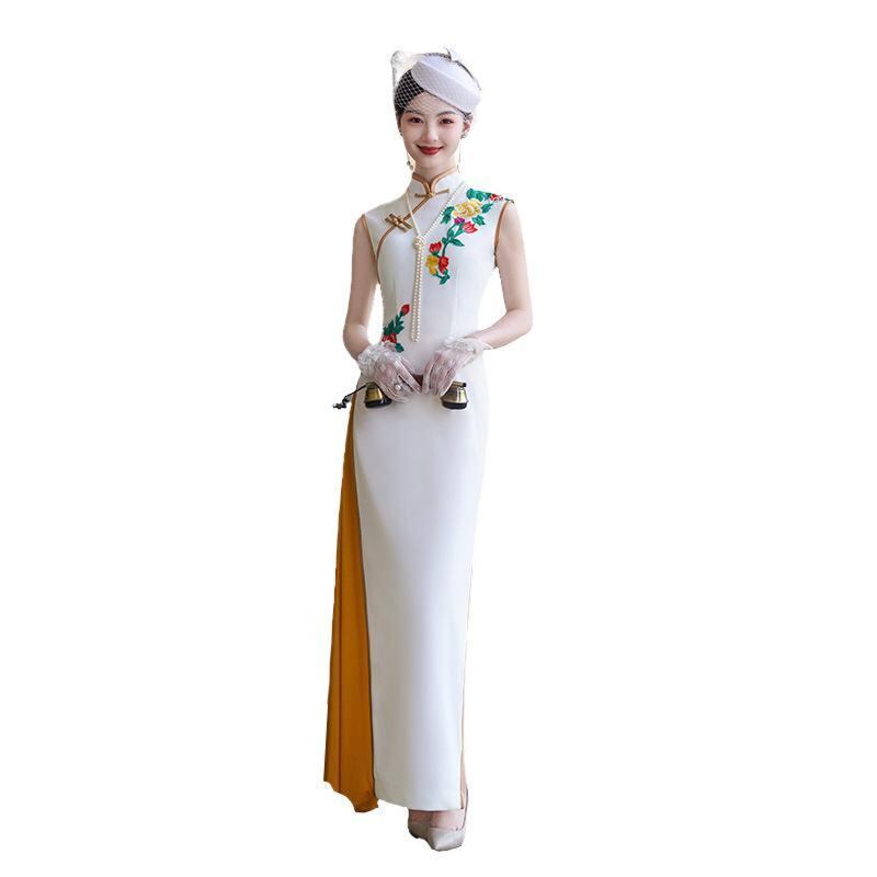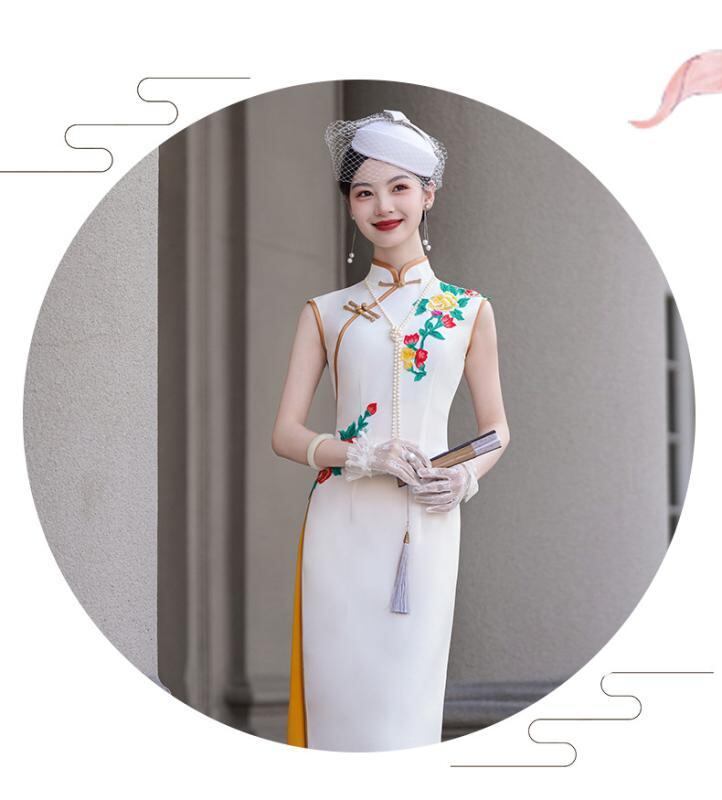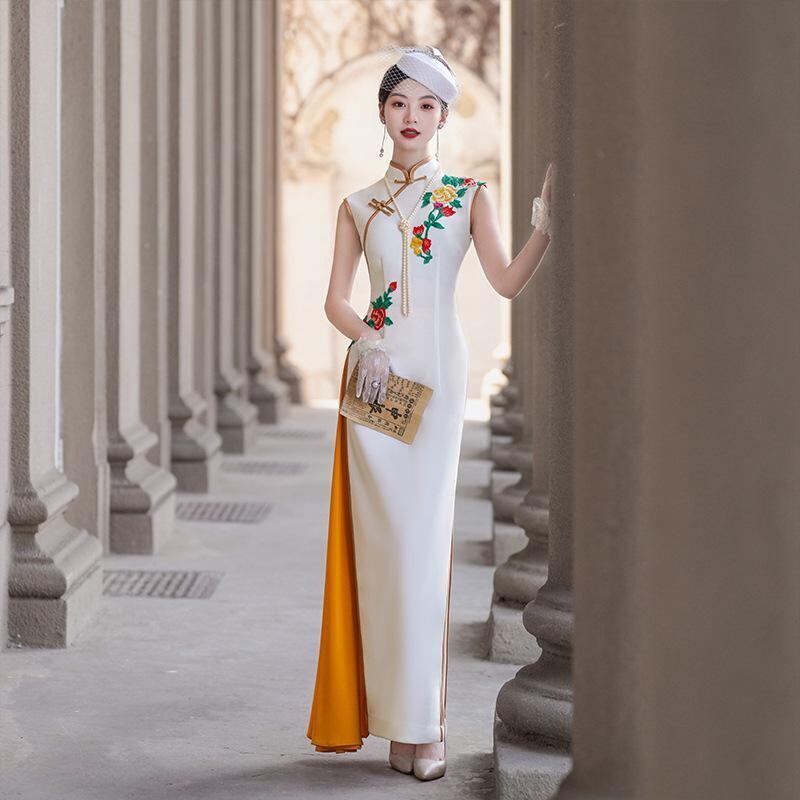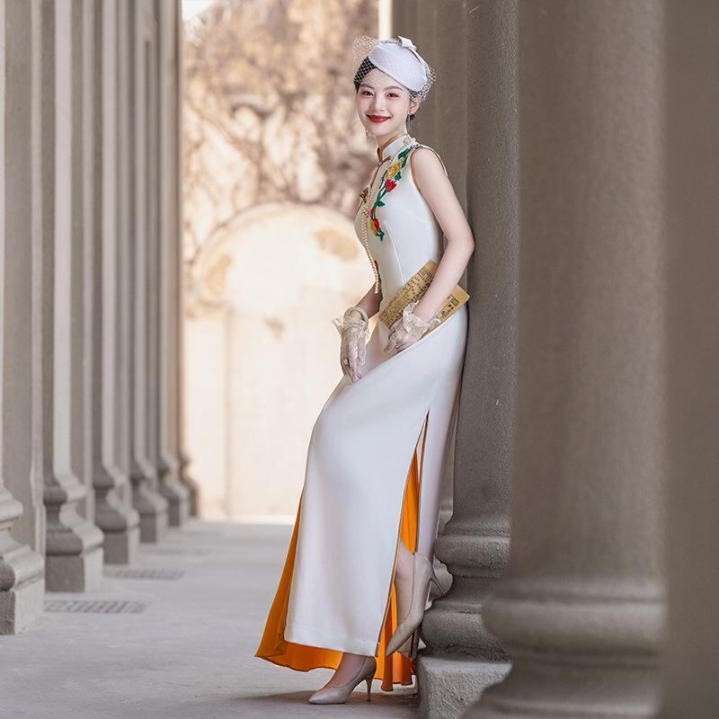 チャイナドレス レディース アオザイ風 モダンチャイナ スタンドカラー ノースリーブ ロング丈 ハイウエストスリット エレガント 上品 伸縮性 パーティードレス ポリエステル素材 ホワイト