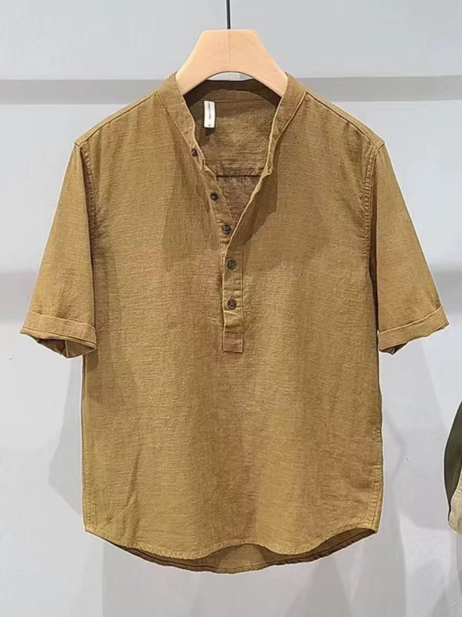 シャツ メンズ 無地 半袖 スタンドカラー リネン 綿麻 洗濯可能 イージーケア ベーシック レギュラーフィット 普段使い カジュアル 夏用 カーキ ブラック