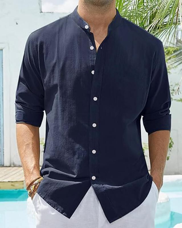 シャツ メンズ ゆったり リラックスフィット 長袖 薄手 スタンドカラー 無地 麻 綿麻 コットンリネン 通気性 イージーケア マシンウォッシャブル カジュアル 普段使い デイリーユース 欧米スタイル 羽織り