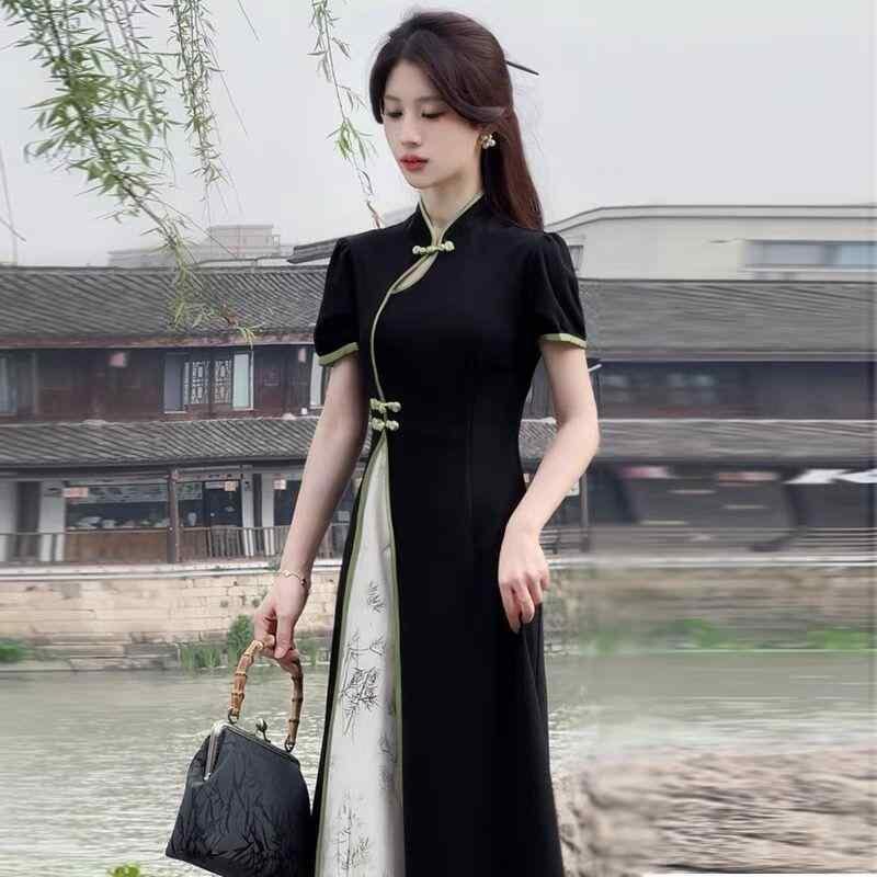 ワンピース レディース 大きいサイズ 夏用 改良チャイナドレス 中華風 上品 エレガント 着痩せ効果 高級感 シェニール素材 ポロ襟 ノースリーブ スリムフィット 体型カバー ミディ丈 着回し 普段使い