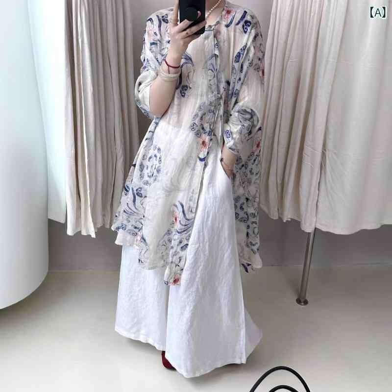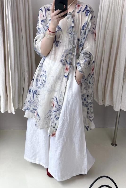 シャツワンピース レディース 大きいサイズ 苧麻 プリント 植物花卉柄 レトロ ミドル丈 Vネック 長袖 薄手 UVカット 羽織り Aライン ルーズウエスト ウエストリボン 着回し