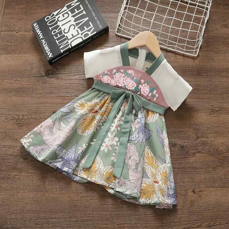 ワンピース キッズ 子供服 ベビー 古風 漢服風 半袖 薄手 Aラインスカート 夏服 ピンク グリーン かわいい おしゃれ 普段使い カジュアル 快適素材 涼しい サラサラ