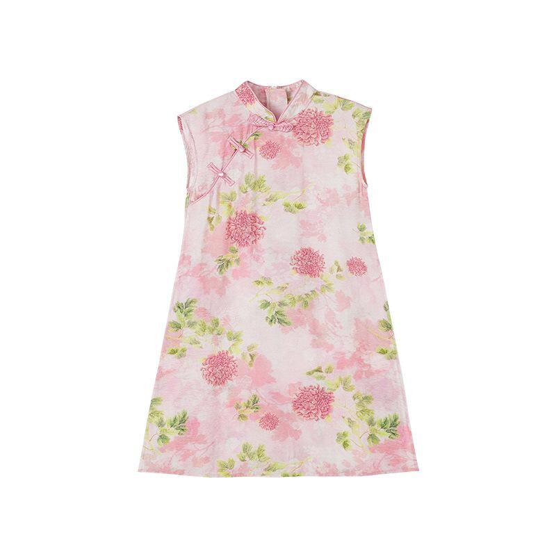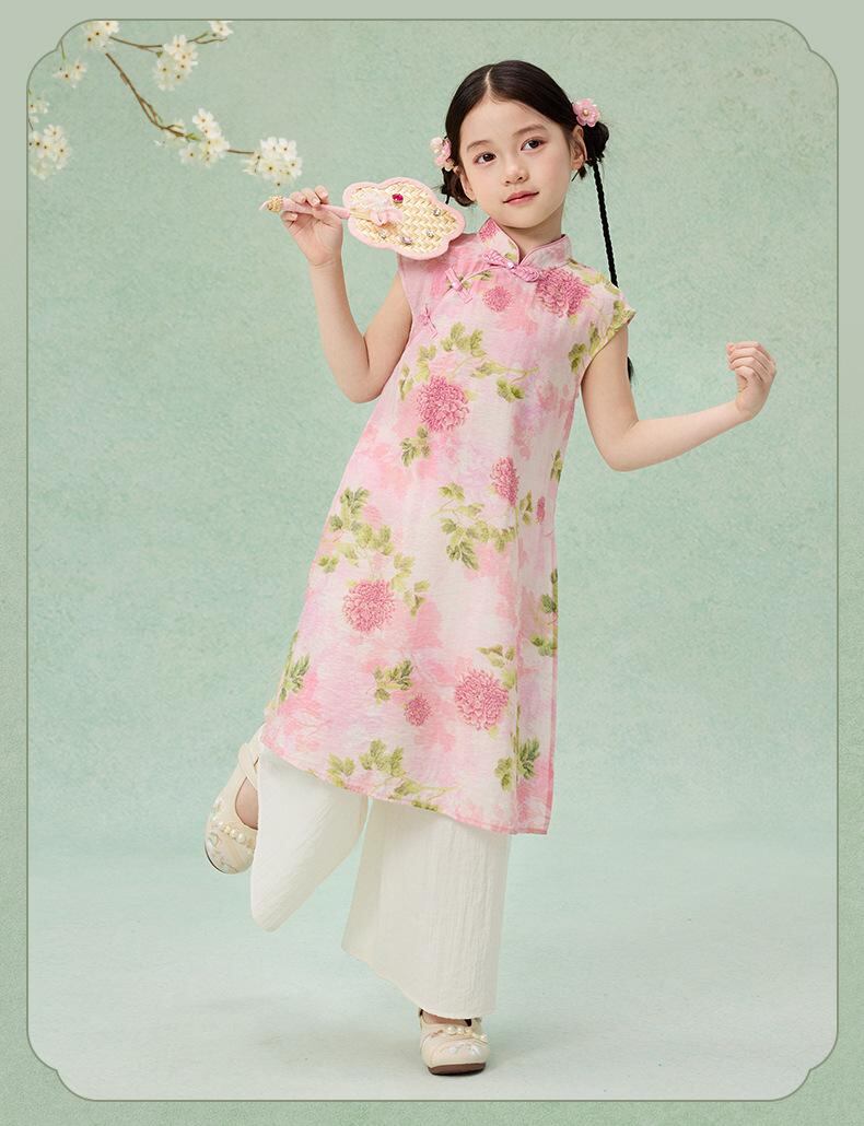 キッズ 女の子 チャイナ風 新中華スタイル セットアップ ツーピース チーパオ風 トップス 半袖 ロングパンツ ビスコース混 柔らか素材 ライトピンク 夏物 お出かけ 普段使い