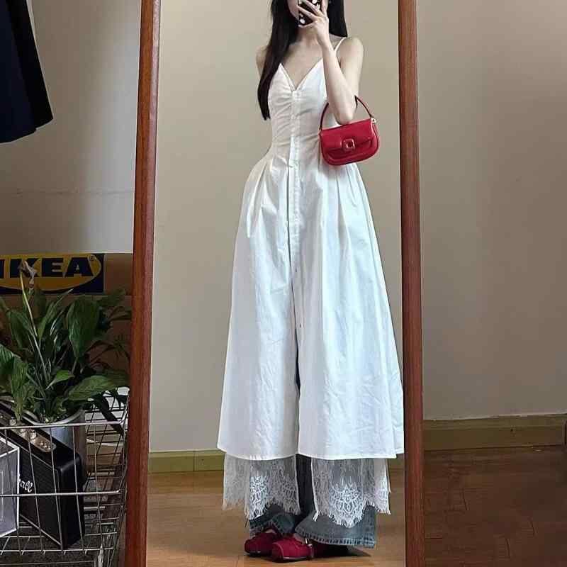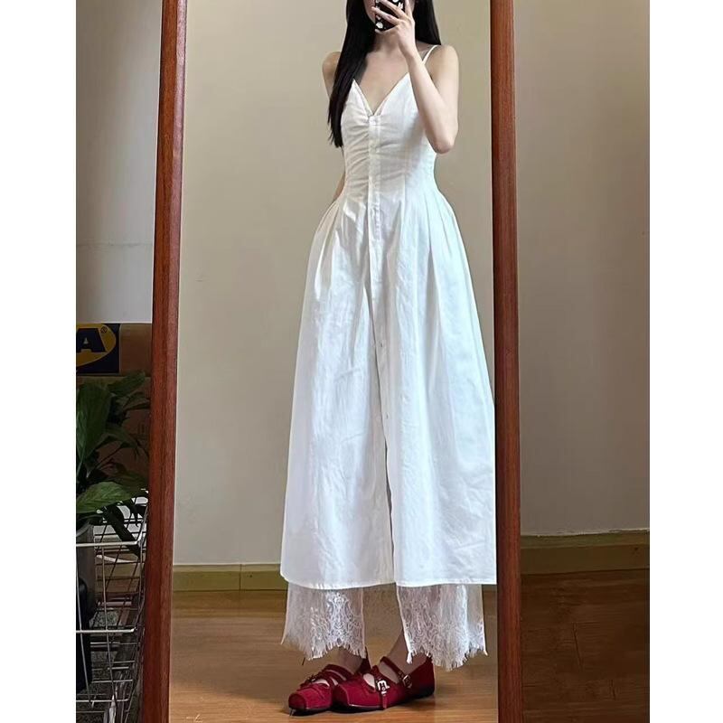 ワンピース レディース フレンチ 純欲系 Vネック ロング丈 キャミソール Aライン ノースリーブ ウエストマーク レース ハイウエスト フロントボタン ポリエステル アイボリー エレガント 上品 デート お呼ばれ