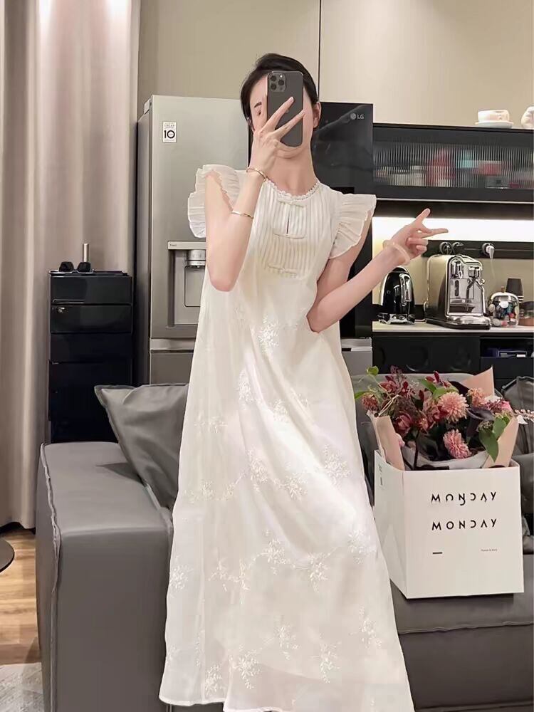 ワンピース レディース 中国風 重工ジャカード刺繡 フリル袖 ロング丈 エレガント 上品 Aライン ラウンドネック 綿混紡 ゆったりウエスト 無地 きれいめ