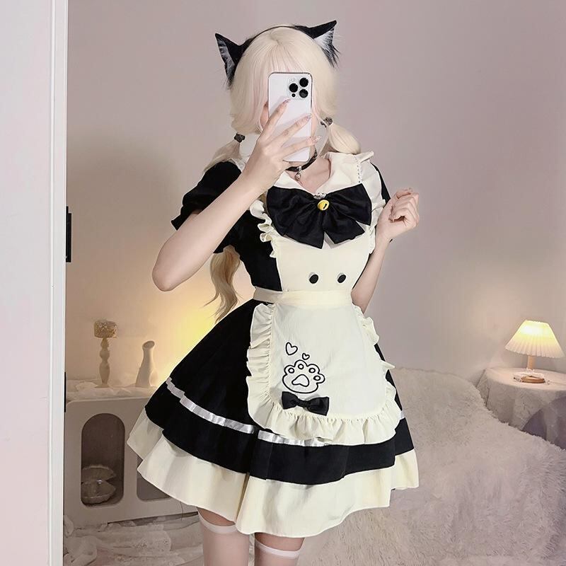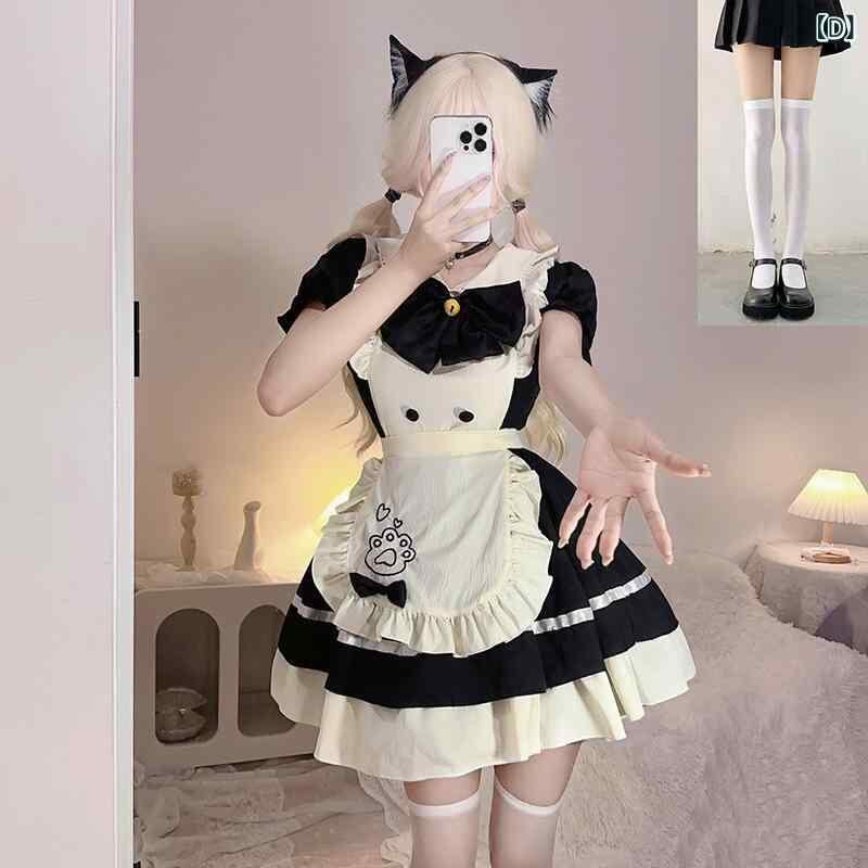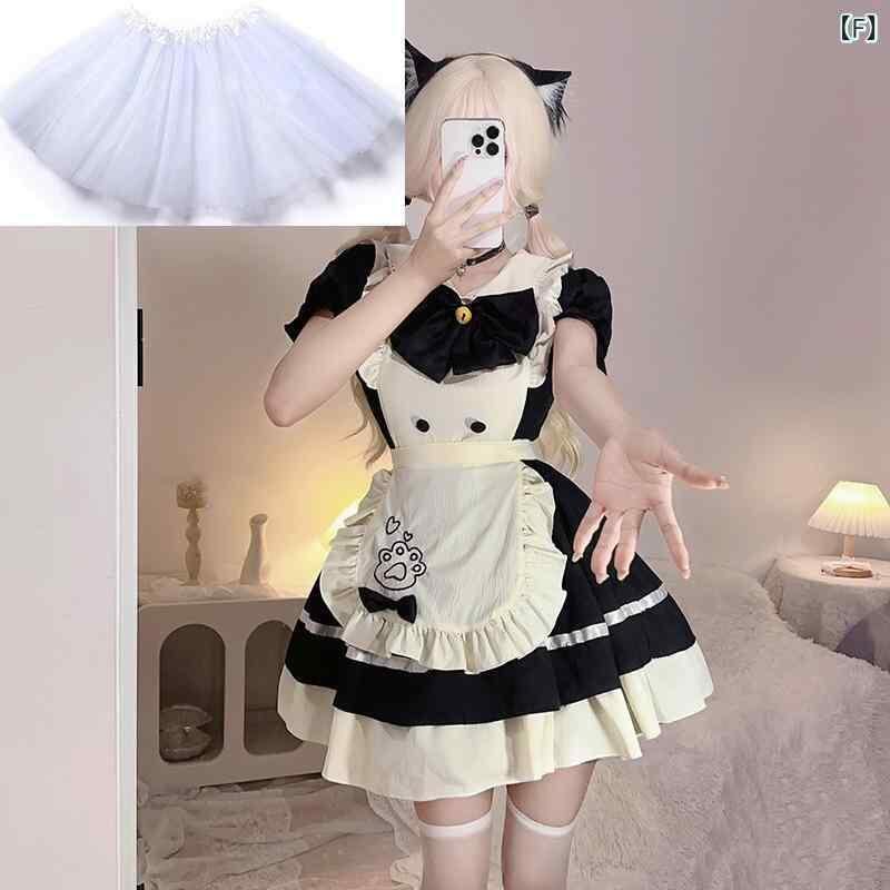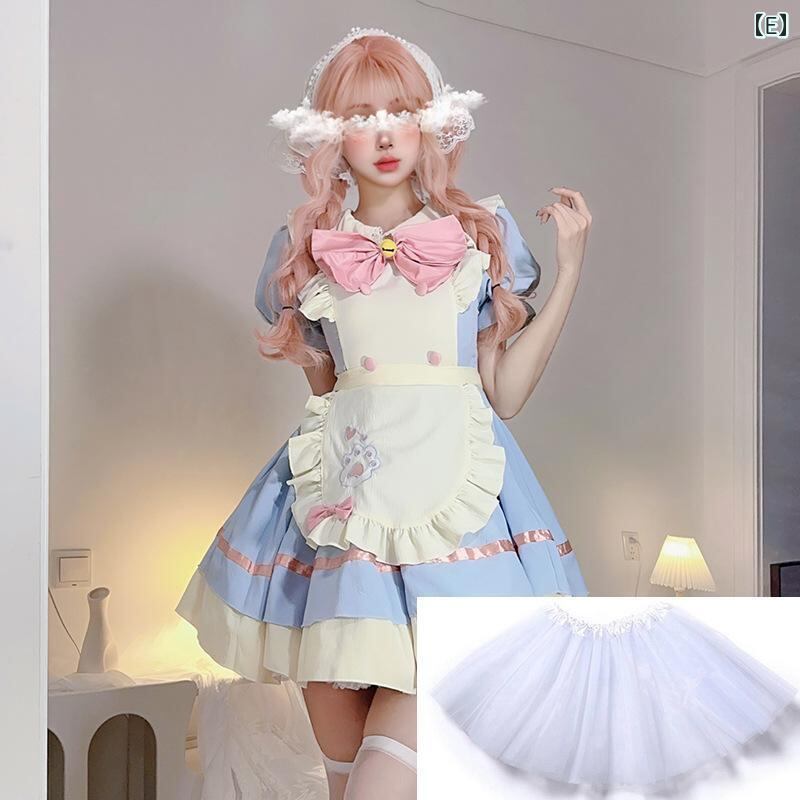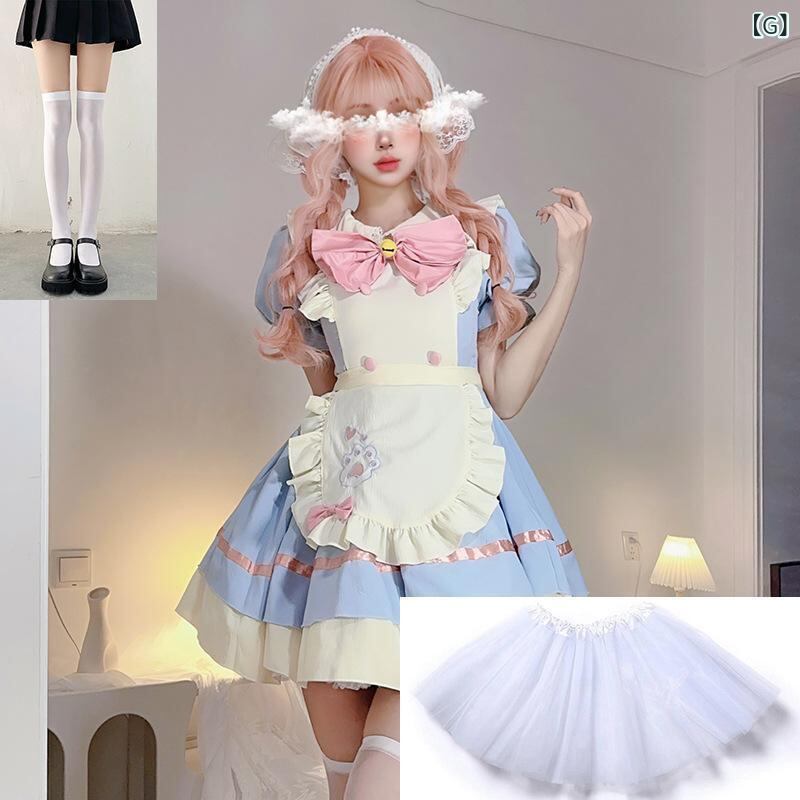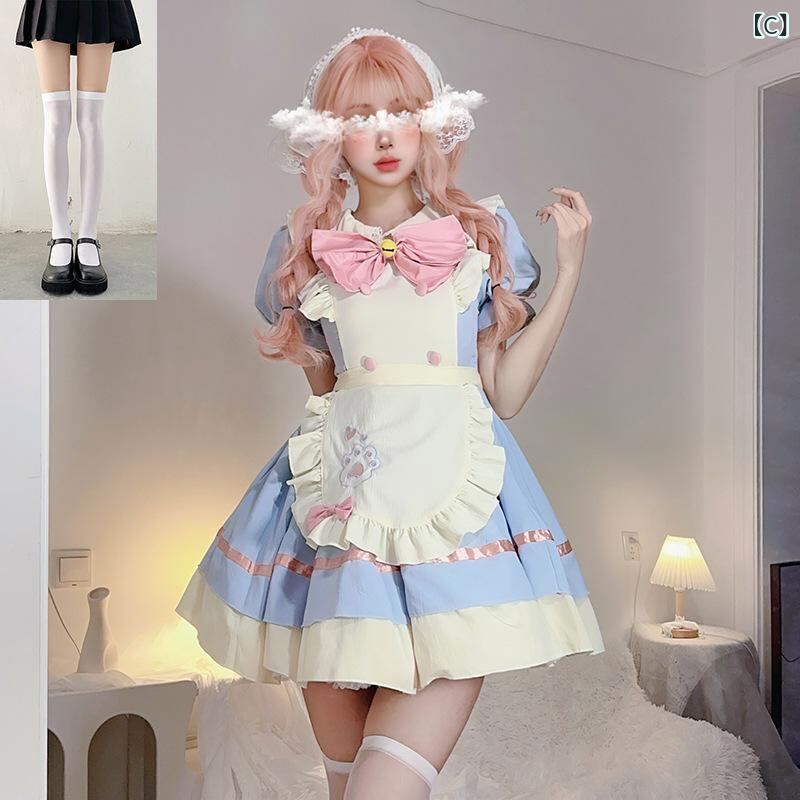 ロリータ ワンピース 少女 女の子 メイド服 かわいい キュート 甘め 猫カフェ ミニ丈 エプロン付き 日系 スウィートガーリー ポリエステル素材 コスプレ イベント アニメ ハロウィン ブルー ブラック