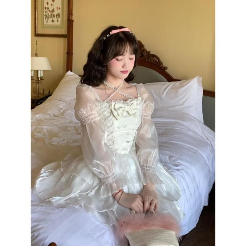 ワンピース ロリータ フェミニン スクエアネック パフスリーブ リボン チュール シアー ミニ丈 プリンセスドレス ティアードスカート ホワイト ガーリー ストリートカジュアル