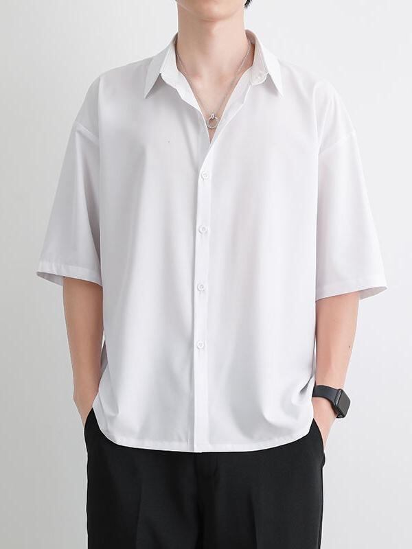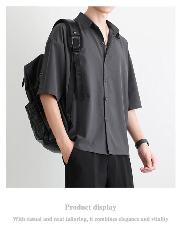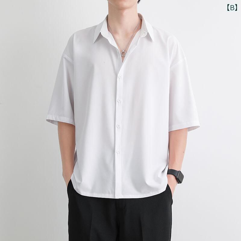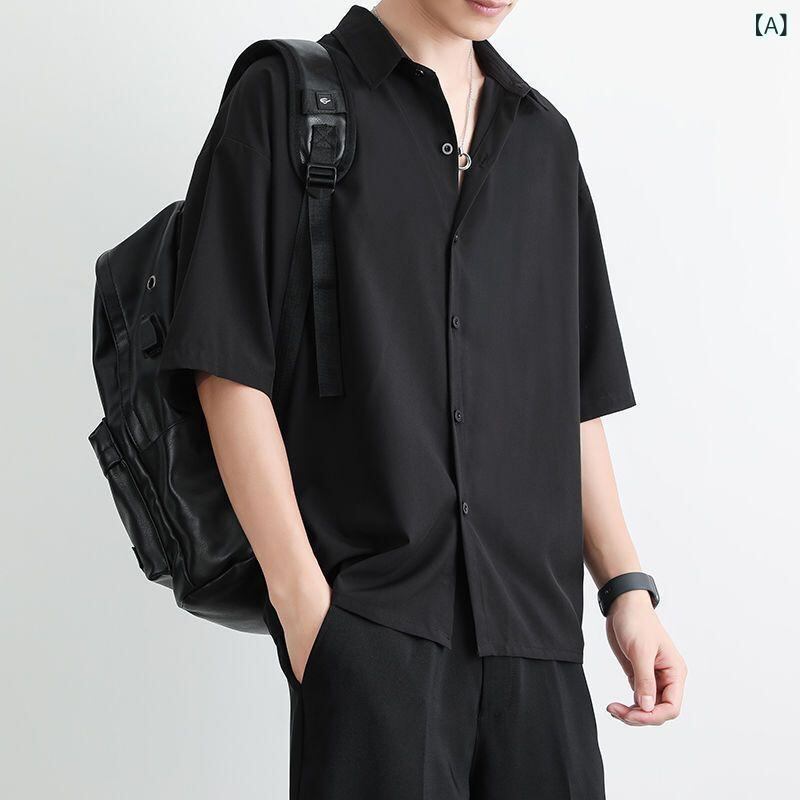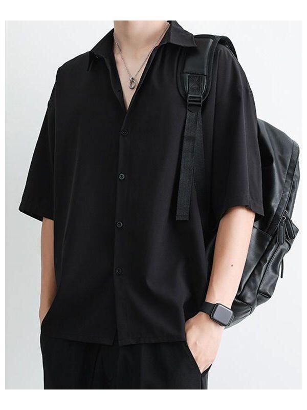 シャツ メンズ 男性用 接触冷感 ドレープ感 とろみ ゆったり 半袖 五分袖 夏物 ポリエステル シワになりにくい 無地 カジュアル リラックスウェア 大人 きれいめ 羽織り ブラック ホワイト グレー