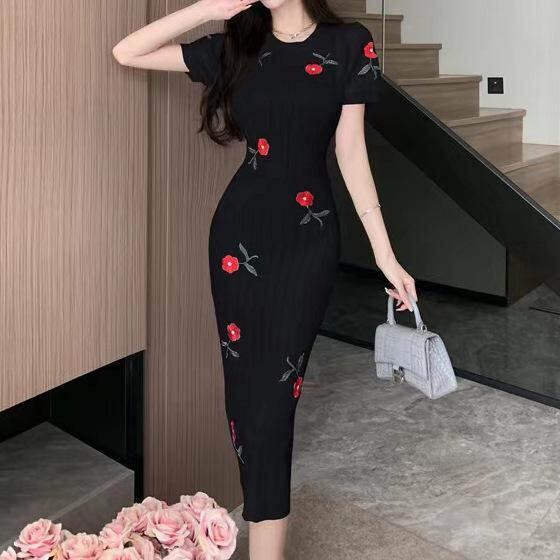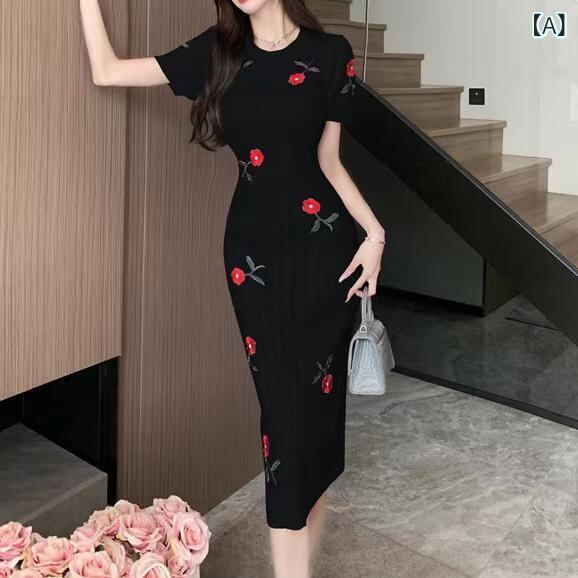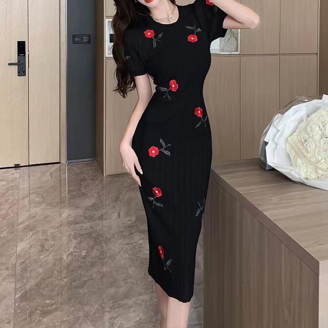 ワンピース レディース ニューチャイナスタイル フレンチエレガンス 薔薇刺繍 ニット パフスリーブ 半袖 ラウンドネック ハイウエスト ミディ丈 タイトシルエット 接触冷感 レーヨン 上品 ブラック ホワイト