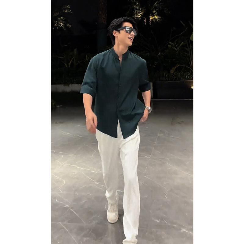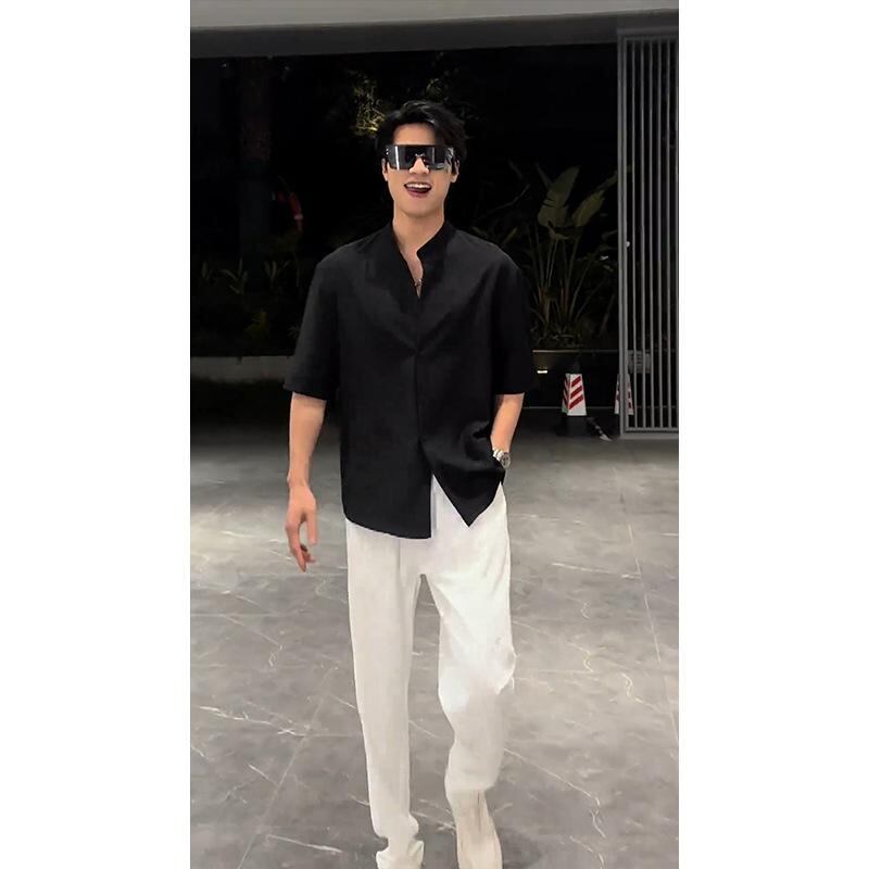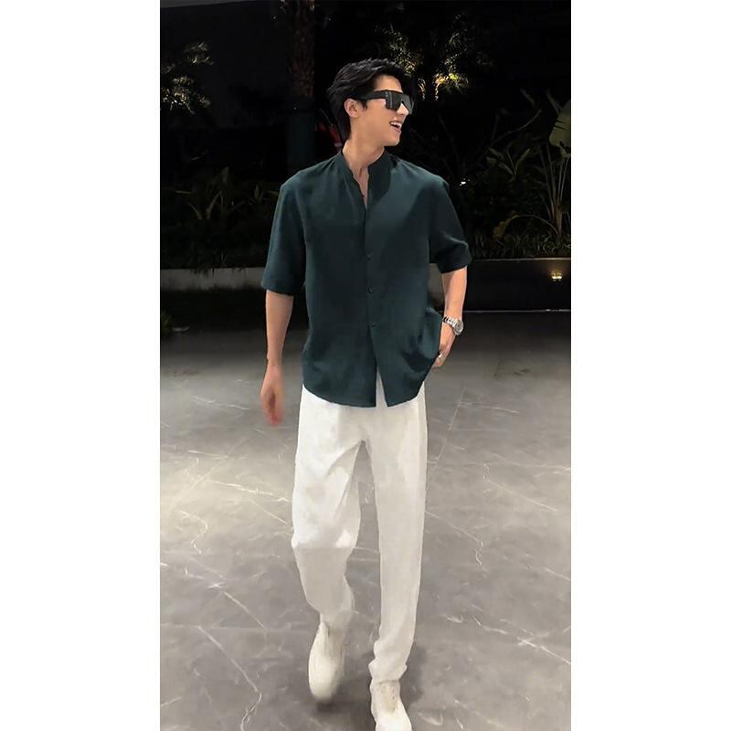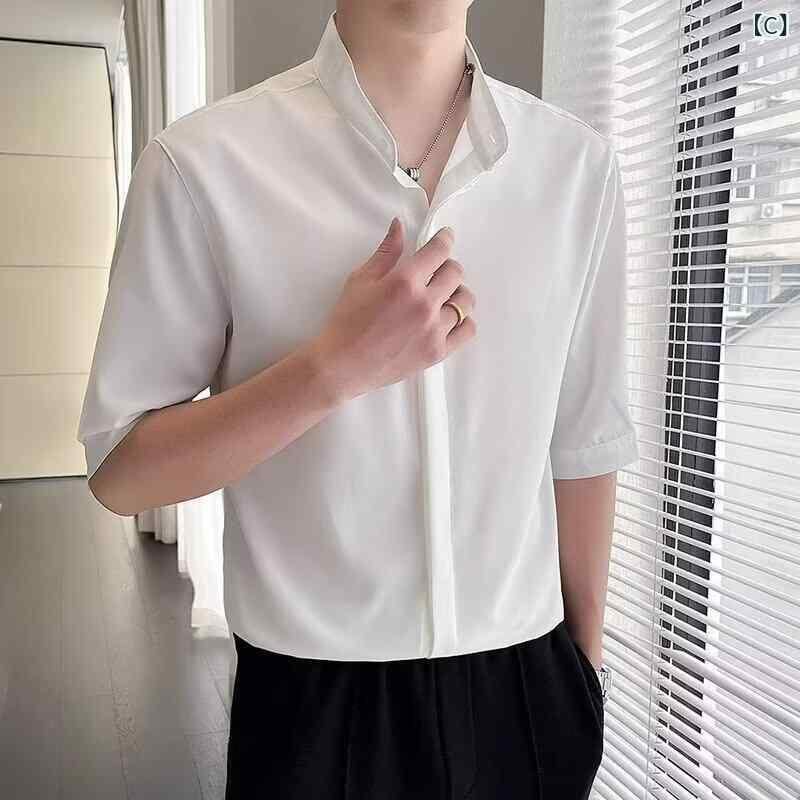 シャツ メンズ 高級感 接触冷感 スタンドカラー 七分袖 ドレープ感 ナイロン ゆったり シルエット 大人カジュアル 普段使い シワになりにくい ブラック グリーン ホワイト