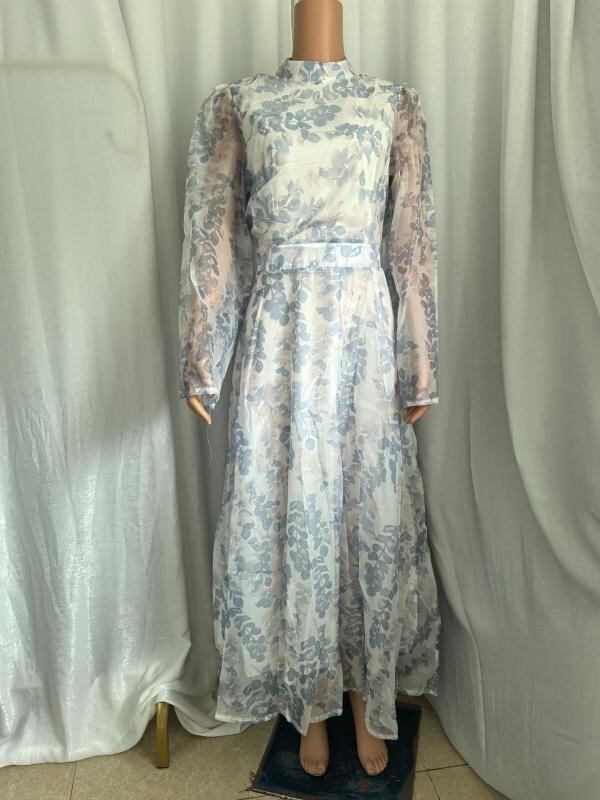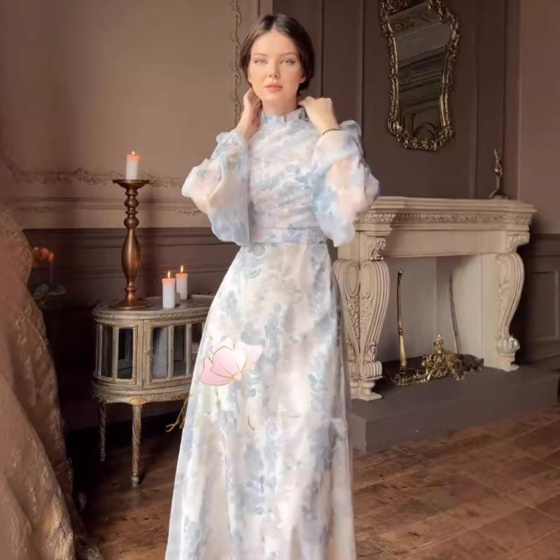 ワンピース レディース エレガント 上品 フレンチスタイル ロング丈 スリムフィット Aライン ベルスリーブ フレアスリーブ ウエストマーク リボンベルト 花柄プリント ハイネック ポリエステル 通勤 オフィス きれいめ