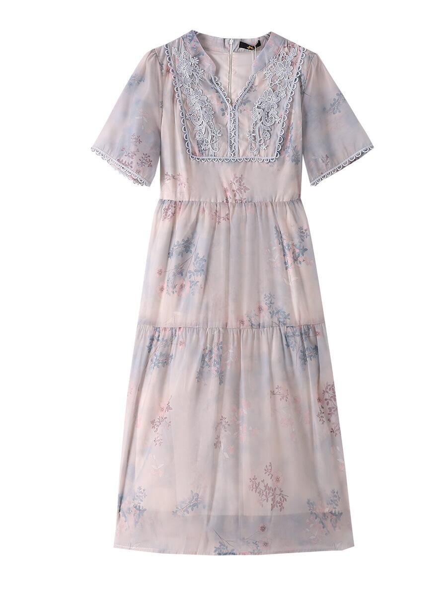 ワンピース レディース 大きいサイズ ゆったり 中華風 レトロモダン 花柄プリント Vネック 半袖 ロング丈 Aライン ポリエステル 夏物 着痩せ効果 エレガント