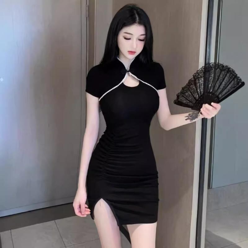 ワンピース レディース セクシー カメラ映え 改良 チャイナドレス 胸元強調 ナイトシーン タイト ヒップライン強調 ミニ丈 スリット 半袖 チャイナカラー 無地 ポリエステル素材 レッド ブラック