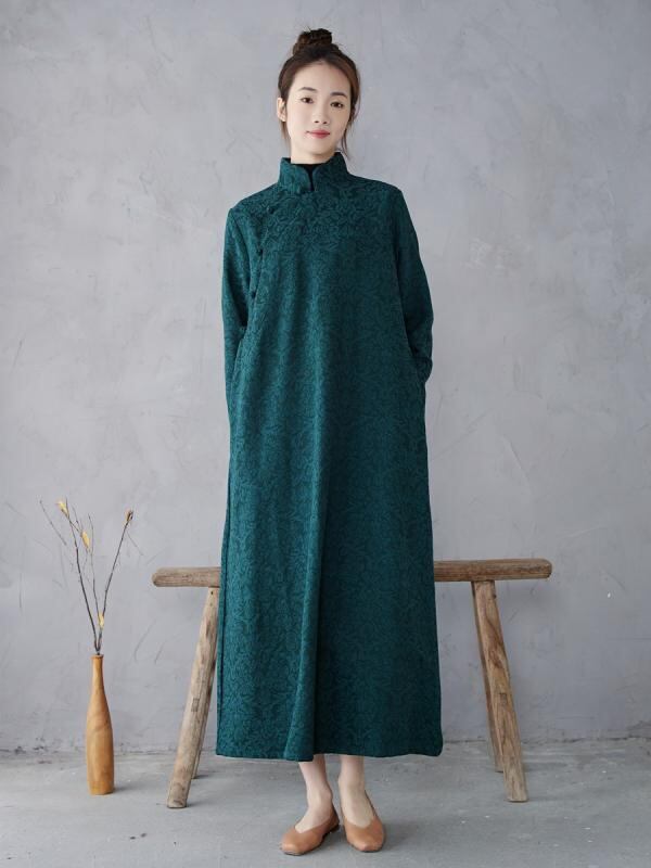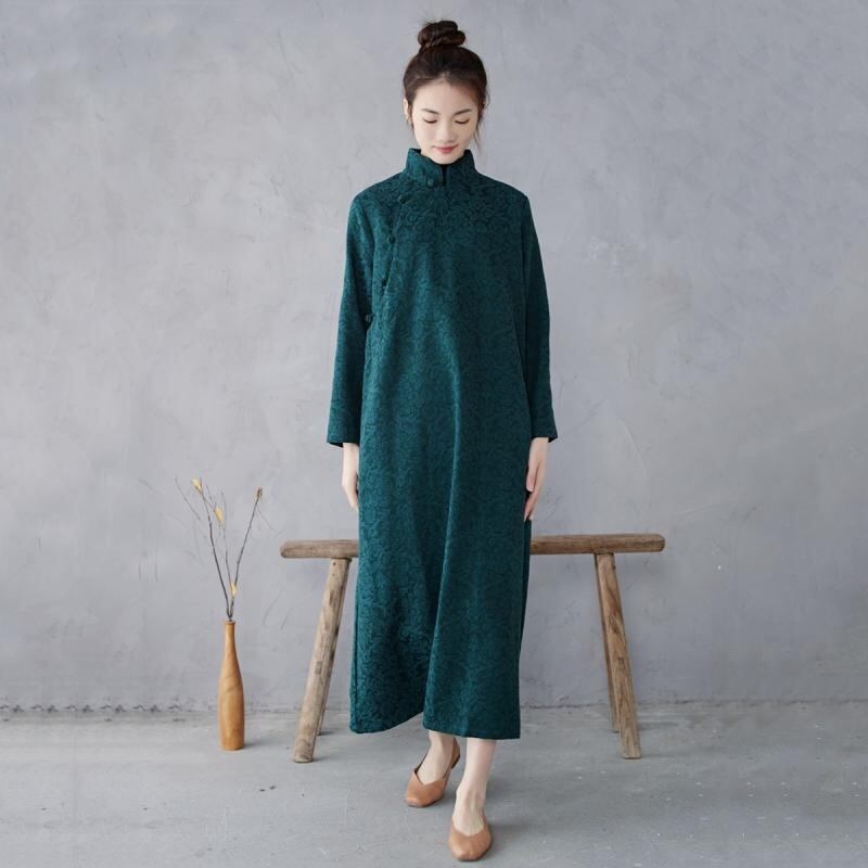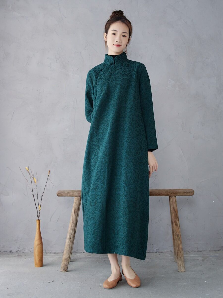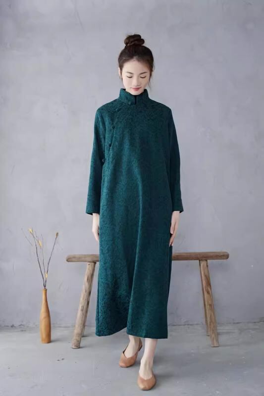 ワンピース レディース チャイナドレス ロング丈 エレガント 上品 ダークグリーン 深緑 綿麻 コットンリネン 長袖 ロングスリーブ ゆったり ルーズ 改良 中華風 オリエンタル スタンドカラー 体型カバー 大きいサイズ プラスサイズ