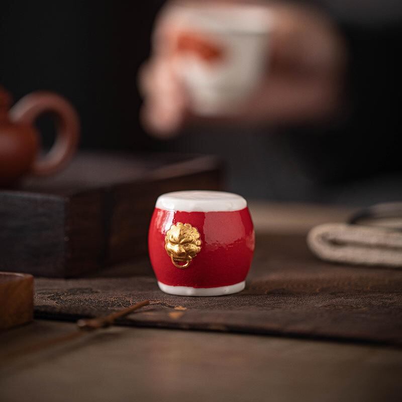 茶道アクセサリー 陶器製 鑼鼓デザイン 蓋置き 茶寵 置物 ユニーク 個性的 急須 湯呑み 碗蓋用 飾り台 赤色 中国風 アジアンテイスト 茶席 茶道具