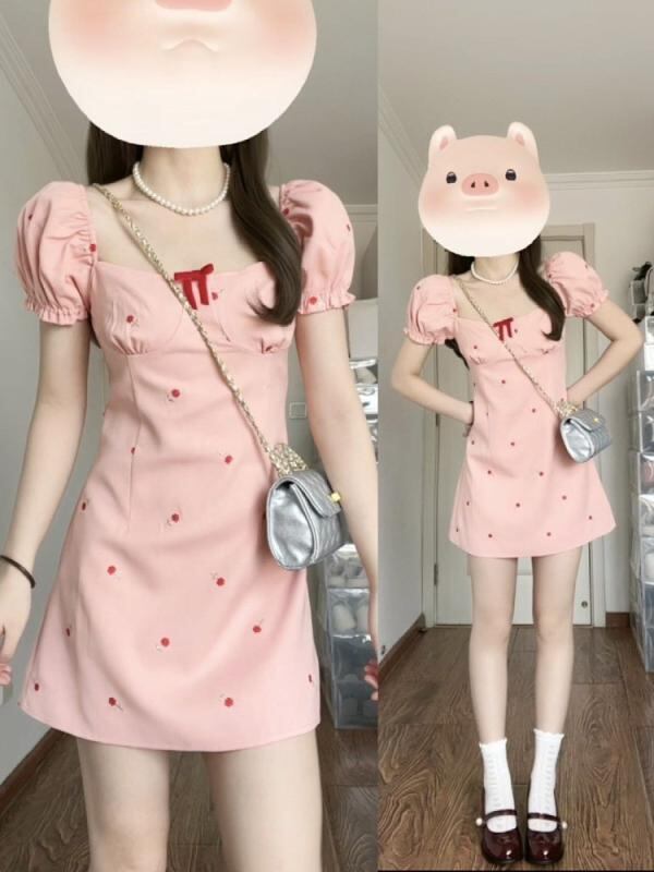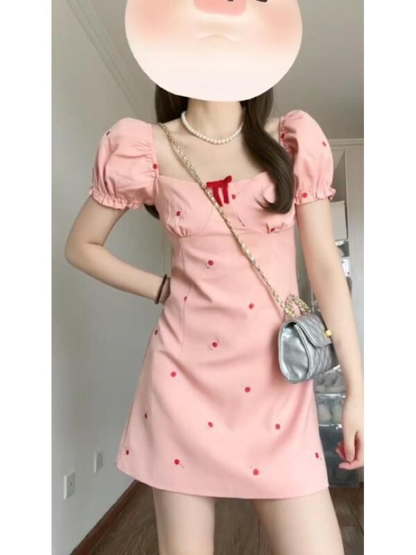 ワンピース 大きいサイズ レディース フレンチスタイル 大人可愛い パフスリーブ ウエストマーク 細見え ロング丈 Aライン スクエアネック 綿 コットン レッド 甘辛スタイル きれいめ通勤 リラックスカジュアル 普段使い 体型カバー