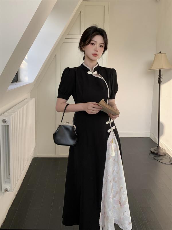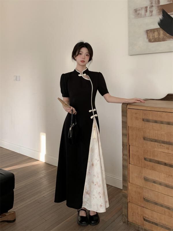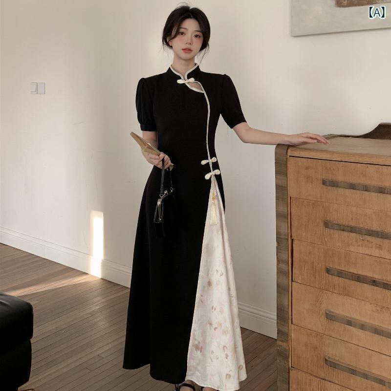 ワンピース レディース ネオチャイニーズ 改良チャイナドレス 半袖 立ち襟 レトロ 上品 エレガント ミモレ丈 Aライン ハイウエスト ポリエステル 無地 ブラック 黒 通勤 オフィス デイリー お出かけ ドレス