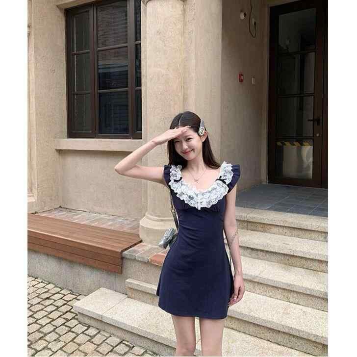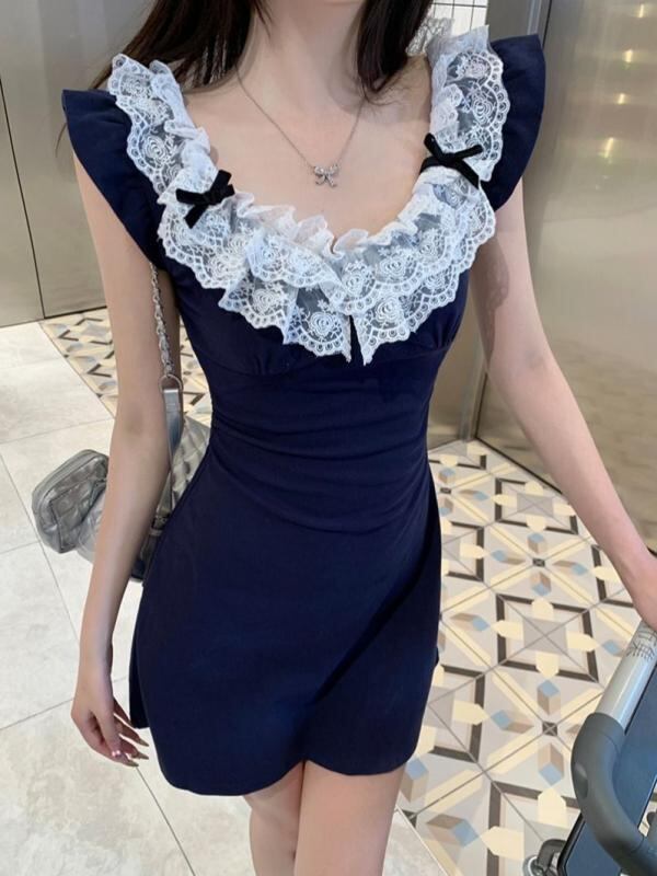 ワンピース レディース 夏 フレンチスタイル セクシー タイト ミニ丈 レース フリル袖 Uネック Aライン ウエストマーク 上品 エレガント ポリエステル ブルー プルオーバー
