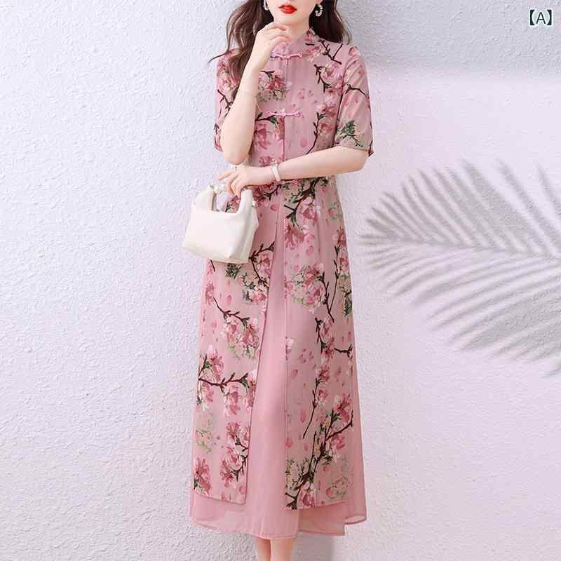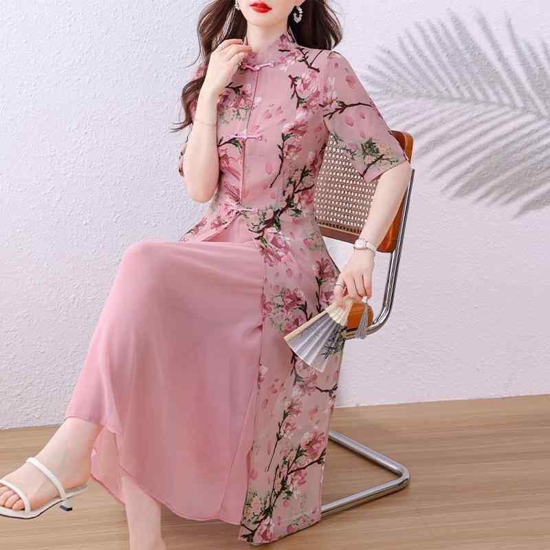 ワンピース レディース モダンチャイナ風 夏 シフォン 花柄 ロング丈 エレガント 上品 高級感 体型カバー 細見え Aライン ハイウエスト 長袖 ピンクドレス