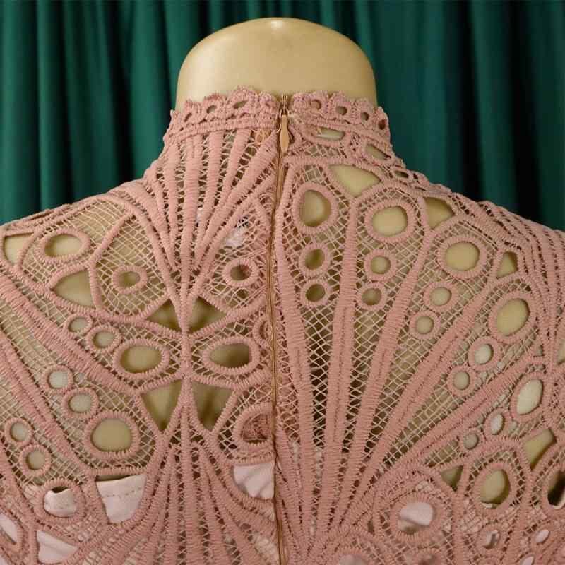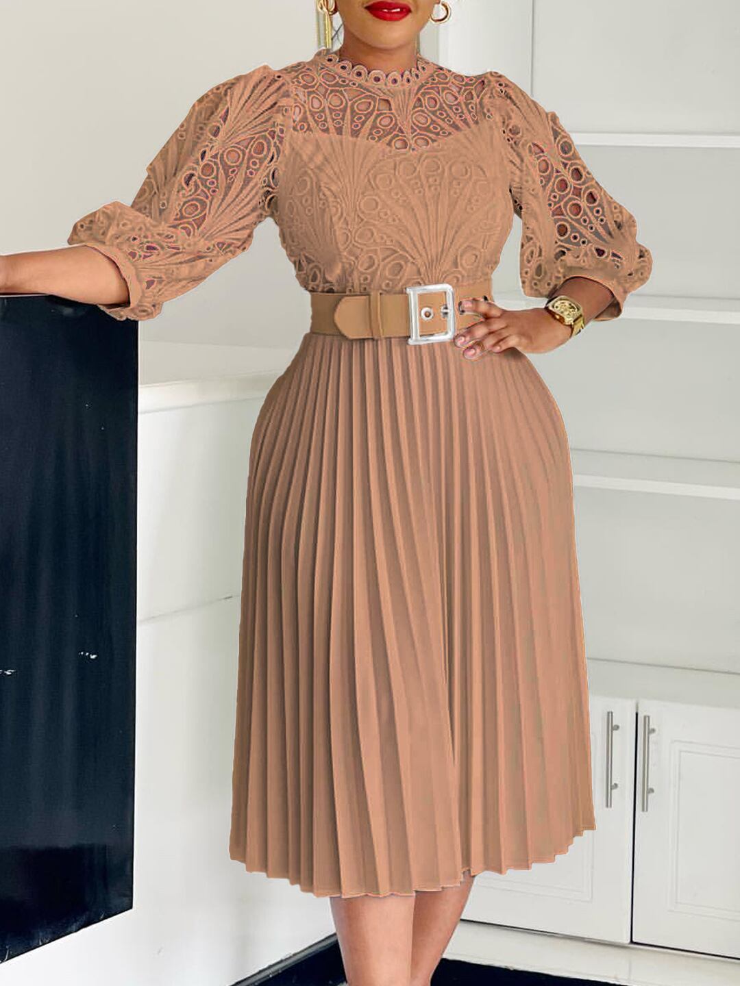 ワンピース レディース 上品 エレガント 欧米風 無地 レース 透かし編み プリーツ ミディ丈 ラウンドネック 七分袖 ランタンスリーブ ハイウエスト 通勤 オフィス ポリエステル
