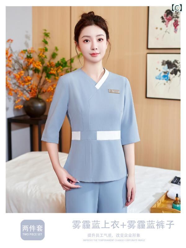 制服 レディース 美容師 エステティシャン セットアップ 上下セット 高級感 ストレッチ 伸縮性 ポリエステル スパンデックス 美容室 エステサロン 施術着 ワークウェア ユニフォーム フットケア 足つぼ 足浴 ネイビー グレー スモーキーブルー