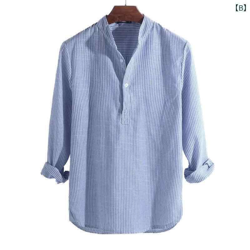 シャツ メンズ Vネック 長袖 スリムフィット ストライプ柄 綿 混紡素材 カジュアル 大人カジュアル 通勤 秋物 レッド ブルー グレー