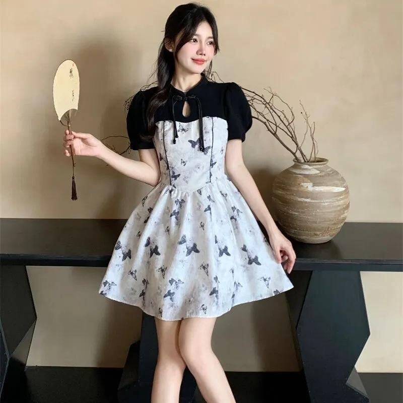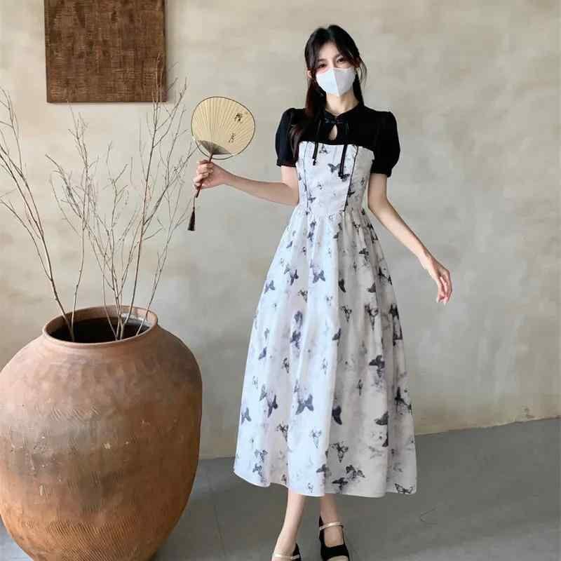 ワンピース レディース 大きいサイズ ゆったり 半袖 新チャイナ風 透かし編み レース バイカラー 配色 切り替え 蝶々 バタフライ 小花柄 フラワー ポリエステル ミディ丈 Aライン スタンドカラー パフスリーブ ハイウエスト カジュアル デイリー 夏
