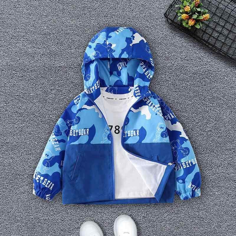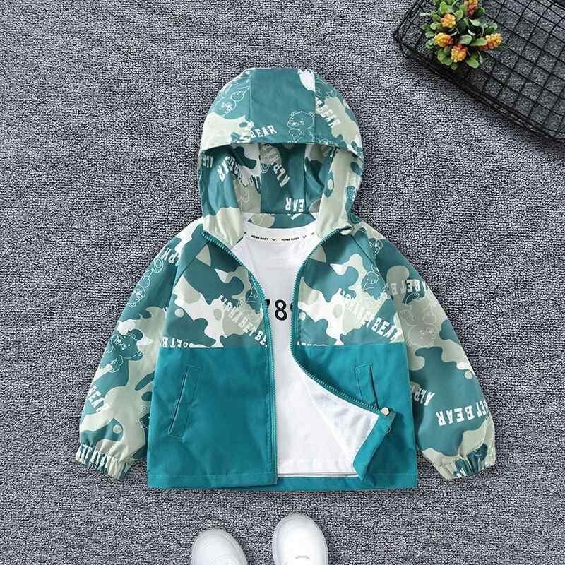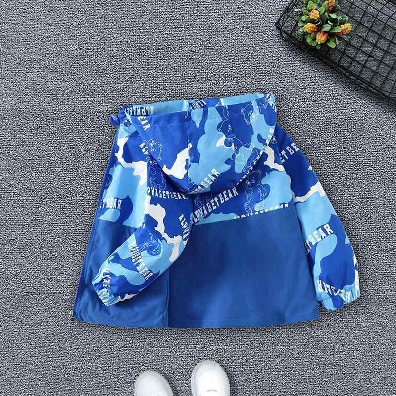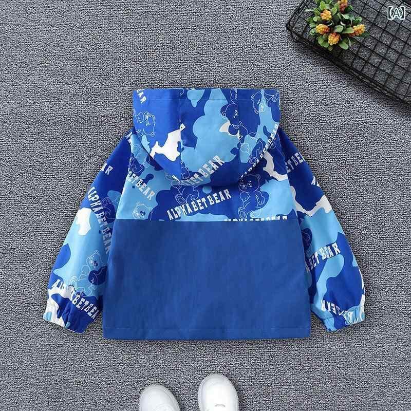 ジャケット 男の子 ジュニア 子供服 春秋 迷彩柄 切り替え フード付き 長袖 ポリエステル ジップアップ アウター 通学 普段使い クール カジュアル 柔らかい ジャンパー ブルー グリーン 配色