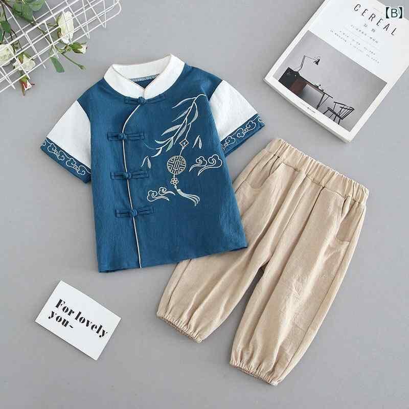 唐装 男の子 子供用 半袖 夏用 セットアップ 漢服 中華風 民族衣装 綿素材 柳葉柄 発表会 イベント 普段着 豆緑 ブルー コットン 上下セット 幼児 小学生