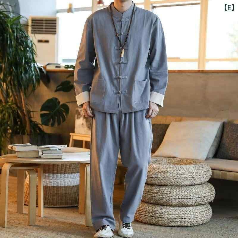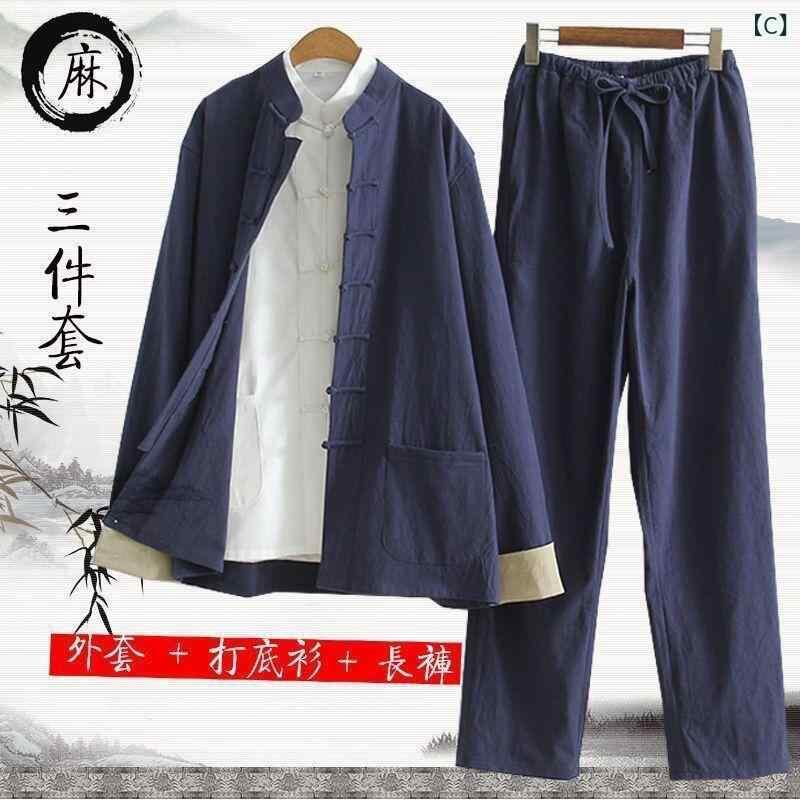 唐装 メンズ 3点セット 伝統服 太極拳ウェア カンフー服 武術服 中高年向け シニア 薄手 ポリエステル ゆったり ミドル丈 ロング丈 チャイナボタン 盤扣 レトロスタイル ブラック グレー ネイビー