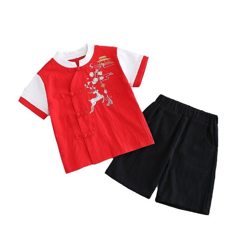 唐装 漢服 男の子 ベビー キッズ 男児 1歳児 幼児 誕生日 お祝い 記念撮影 礼服 フォーマルウェア 中国風 チャイナ風 古装 民族衣装 レトロ 薄手 綿100% コットン 半袖 上下セット セットアップ 花柄