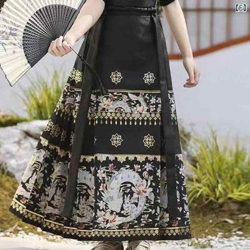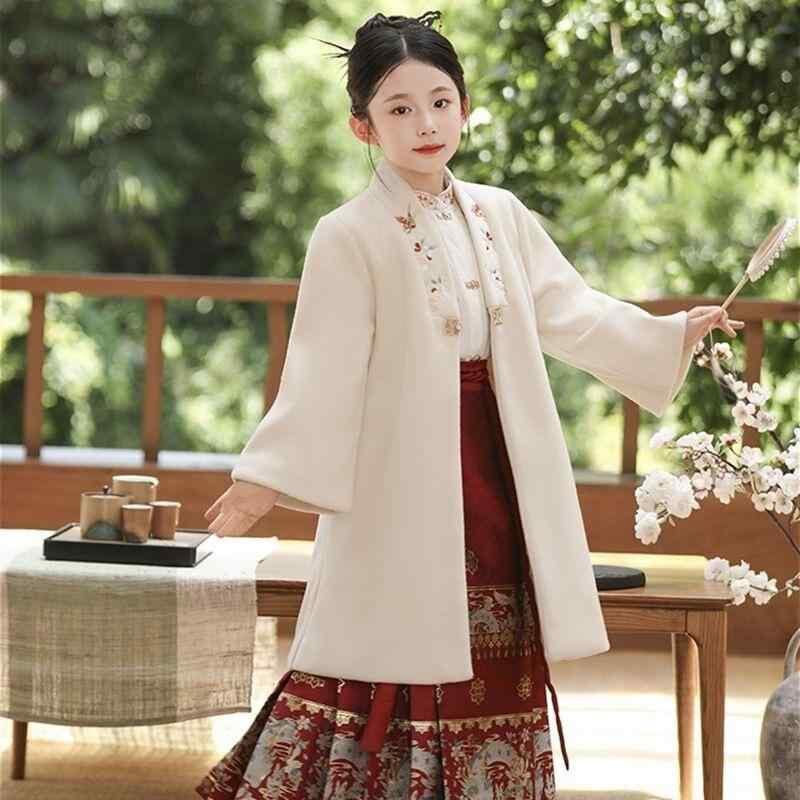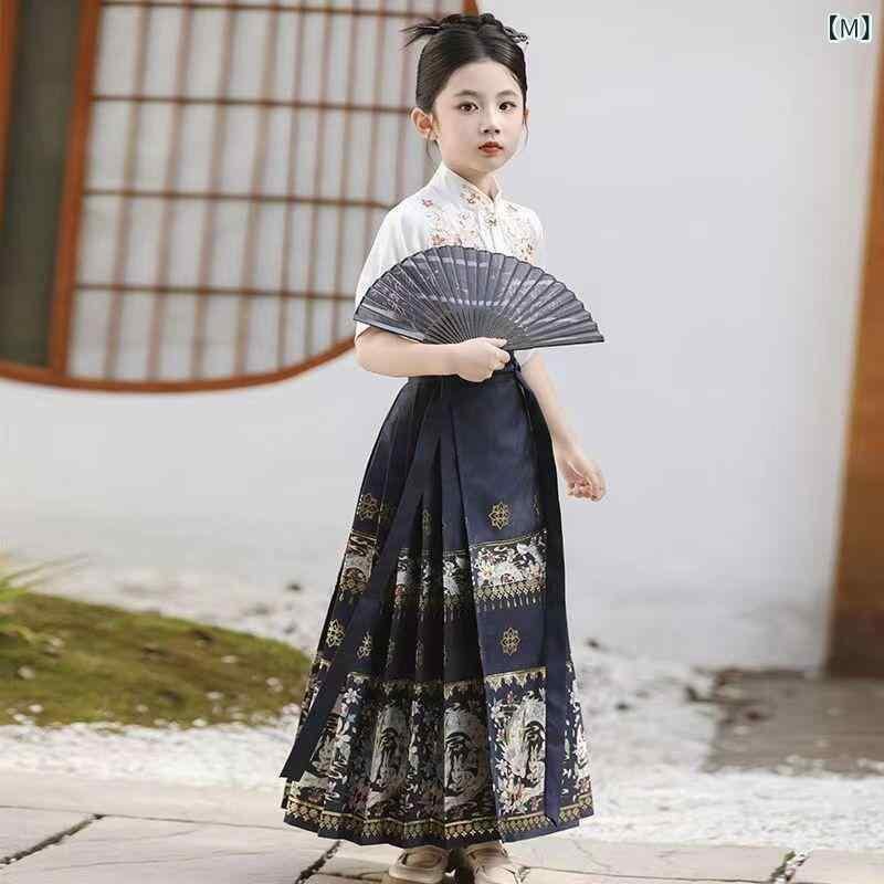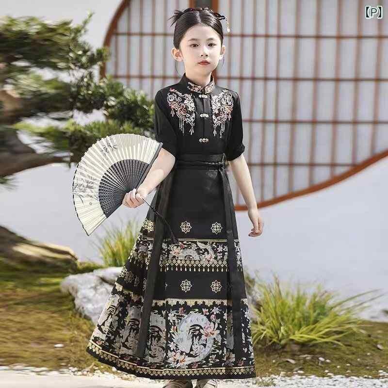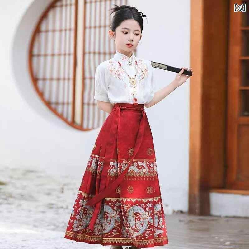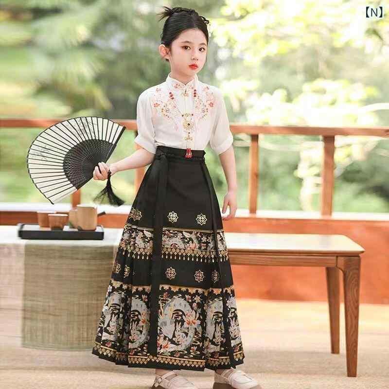 漢服 キッズ 女の子 上下セット 馬面スカート 中国風 新中式 古典風 長袖 半袖 織金 刺繍 麻 ポリエステル素材 白 黒 紺 ワインレッド 通年 お出かけ 発表会 イベント 衣装 コスチューム